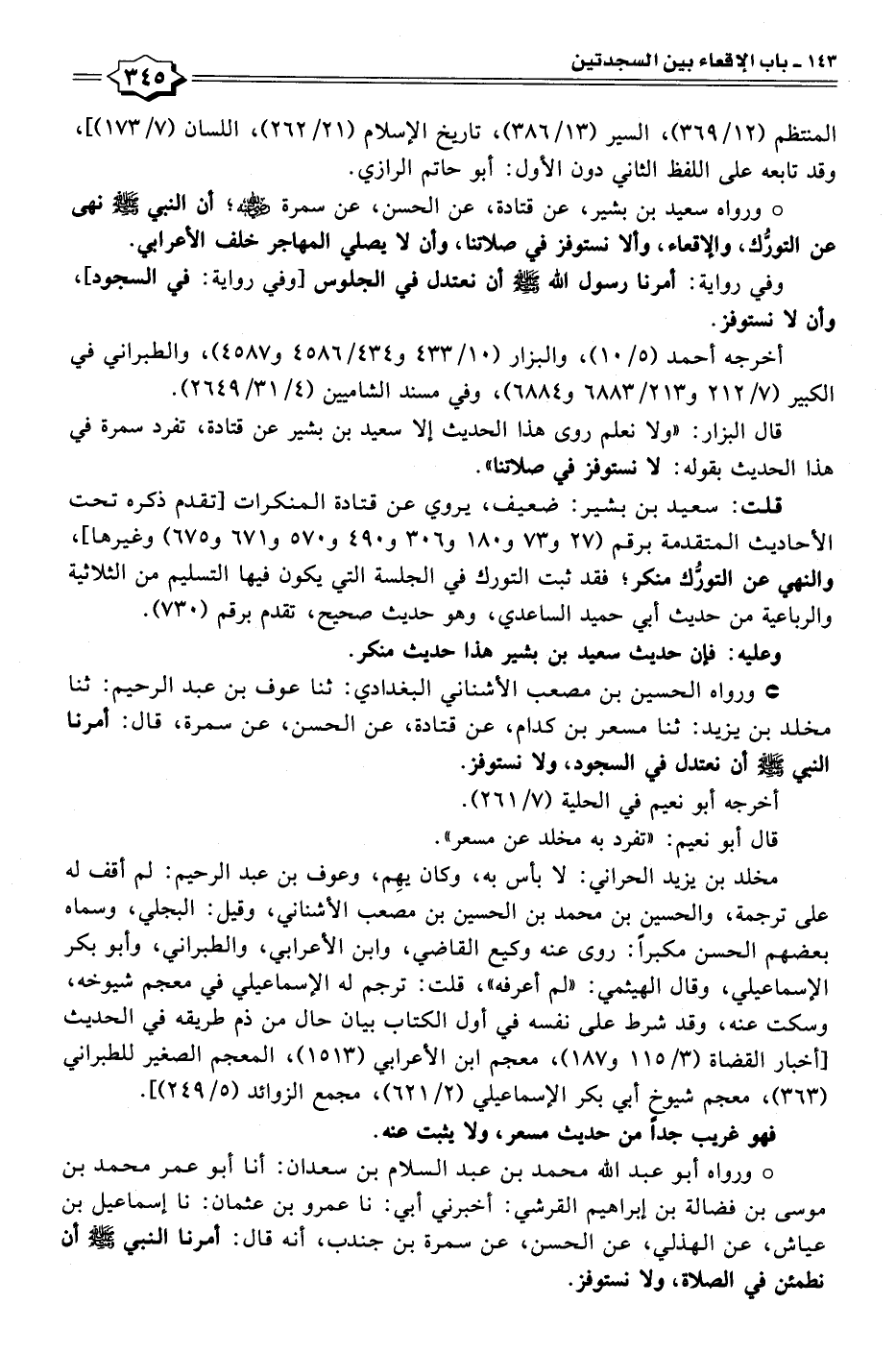 • ورواه سعيد بن بشير، عن قتادة، عن الحسن، عن سمرة - رضي الله عنه -؛ أن النبي - صلى الله عليه وسلم - نهى عن التورُّك، والإقعاء، وألا نستوفز في صلاتنا، وأن لا يصلي المهاجر خلف الأعرابي.