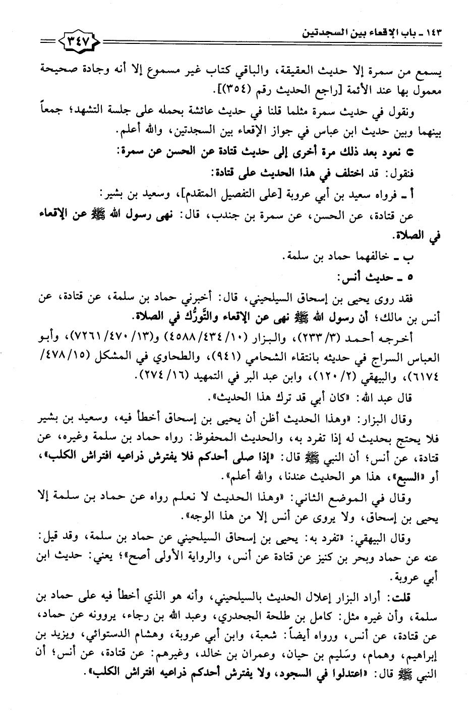 قلت: أراد البزار إعلال الحديث بالسيلحيني، وأنه هو الذي أخطأ فيه على حماد بن سلمة، وأن غيره مثل: كامل بن طلحة الجحدري، وعبد الله بن رجاء، يروونه عن حماد، عن قتادة، عن أنس، ورواه أيضًا: شعبة، وابن أبي عروبة، وهشام الدستوائي، ويزيد بن إبراهيم، وهمام، وسَليم بن حيان، وعمران بن خالد، وغيرهم: عن قتادة، عن أنس؛ أن النبي - صلى الله عليه وسلم - قال: "اعتدلوا في السجود، ولا يفترش أحدكم ذراعيه افتراش الكلب".