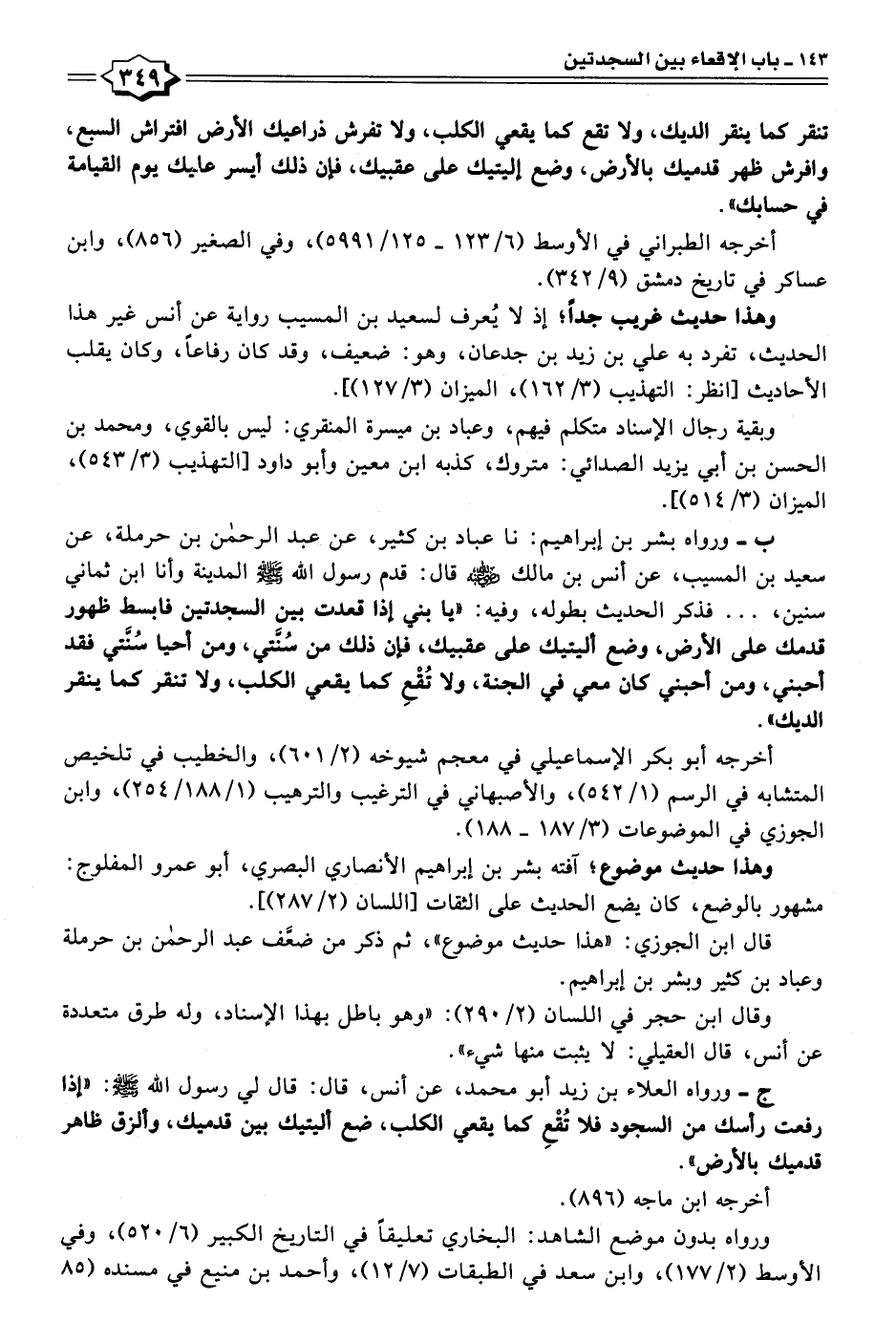ب - ورواه بشر بن إبراهيم: نا عباد بن كثير، عن عبد الرحمن بن حرملة، عن سعيد بن المسيّب، عن أنس بن مالك - رضي الله عنه - قال: قدم رسول الله - صلى الله عليه وسلم - المدينة وأنا ابن ثماني سنين،. . . فذكر الحديث بطوله، وفيه: "يا بني إذا قعدت بين السجدتين فابسط ظهور قدمك على الأرض، وضع أليتيك على عقبيك، فإن ذلك من سُنَّتي، ومن أحيا سُنَّتي فقد أحبني، ومن أحبني كان معي في الجنة، ولا تُقْعِ كما يقعي الكلب، ولا تنقر كما ينقر الديك".