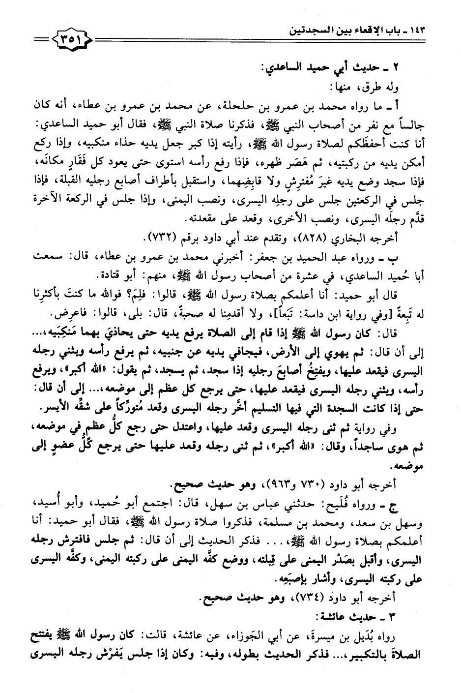 ج - ورواه فُلَيح: حدثني عباس بن سهل، قال: اجتمع أبو حُميد، وأبو أسيد، وسهل بن سعد، ومحمد بن مسلمة، فذكروا صلاة رسول الله - صلى الله عليه وسلم -، فقال أبو حميد: أنا أعلمكم بصلاة رسول الله - صلى الله عليه وسلم -،. . . فذكر الحديث إلى أن قال: ثمَّ جلس فافترش رجله اليسرى، وأقبل بصَدْر اليمنى على قِبلته، ووضع كفَّه اليمنى على ركبته اليمنى، وكفَّه اليسرى على ركبته اليسرى، وأشار بإصبَعِه.