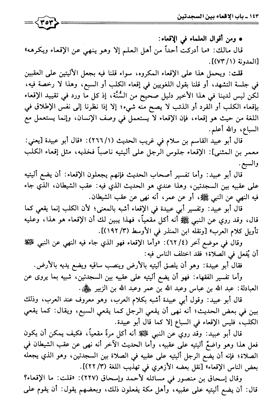 قال أبو عبيد: وقول أبي عبيدة أشبه بكلام العرب، وهو معروف عند العرب، وذلك بين في بعض الحديث؛ أنَّه نهى أن يقعي الرجل كما يقعي السبع، ويقال: كما يقعي الكلب، فليس الإقعاء في السباع إلا كما قال أبو عبيدة.