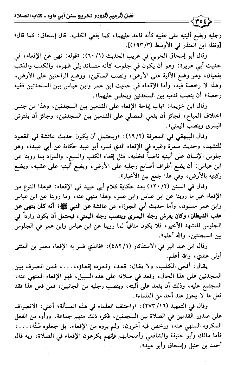وقال في السنن (٢/ ١٢٠) بعد حكاية كلام أبي عبيد في الإقعاء: "وهذا النوع من الإقعاء غير ما روينا عن ابن عباس وابن عمر، وهذا منهي عنه، وما روينا عن ابن عباس وابن عمر مسنون، وأما حديث أبي الجوزاء عن عائشة عن النبي - صلى الله عليه وسلم -؛ أنَّه كان ينهى عن عقب الشيطان، وكان يفرش رجله اليسرى وينصب رجله اليمني، فيحتمل أن يكون واردًا في الجلوس للتشهد الأخير، فلا يكون منافيًا لما روينا عن ابن عباس وابن عمر في الجلوس بين السجدتين، والله أعلم".