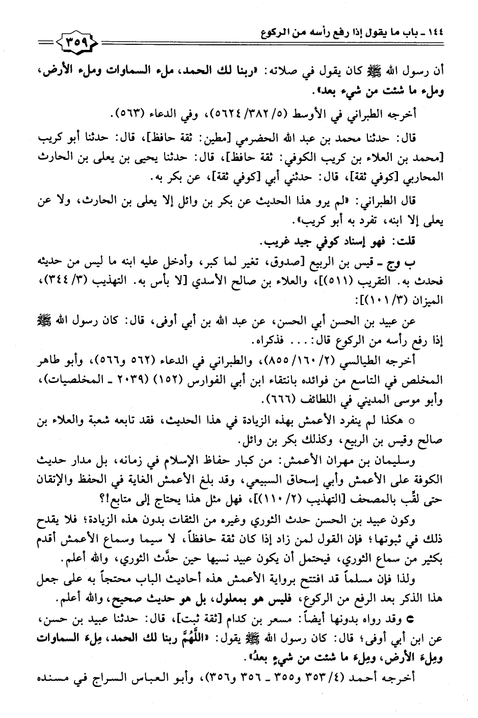 • وقد رواه بدونها أيضًا: مسعر بن كدام [ثقة ثبت]، قال: حدثنا عبيد بن حسن، عن ابن أبي أوفى؛ قال: كان رسول الله - صلى الله عليه وسلم - يقول: "اللَّهُمَّ ربنا لك الحمد، مِلءَ السماوات ومِلءَ الأرض، ومِلءَ ما شئت من شيءٍ بعدُ".
