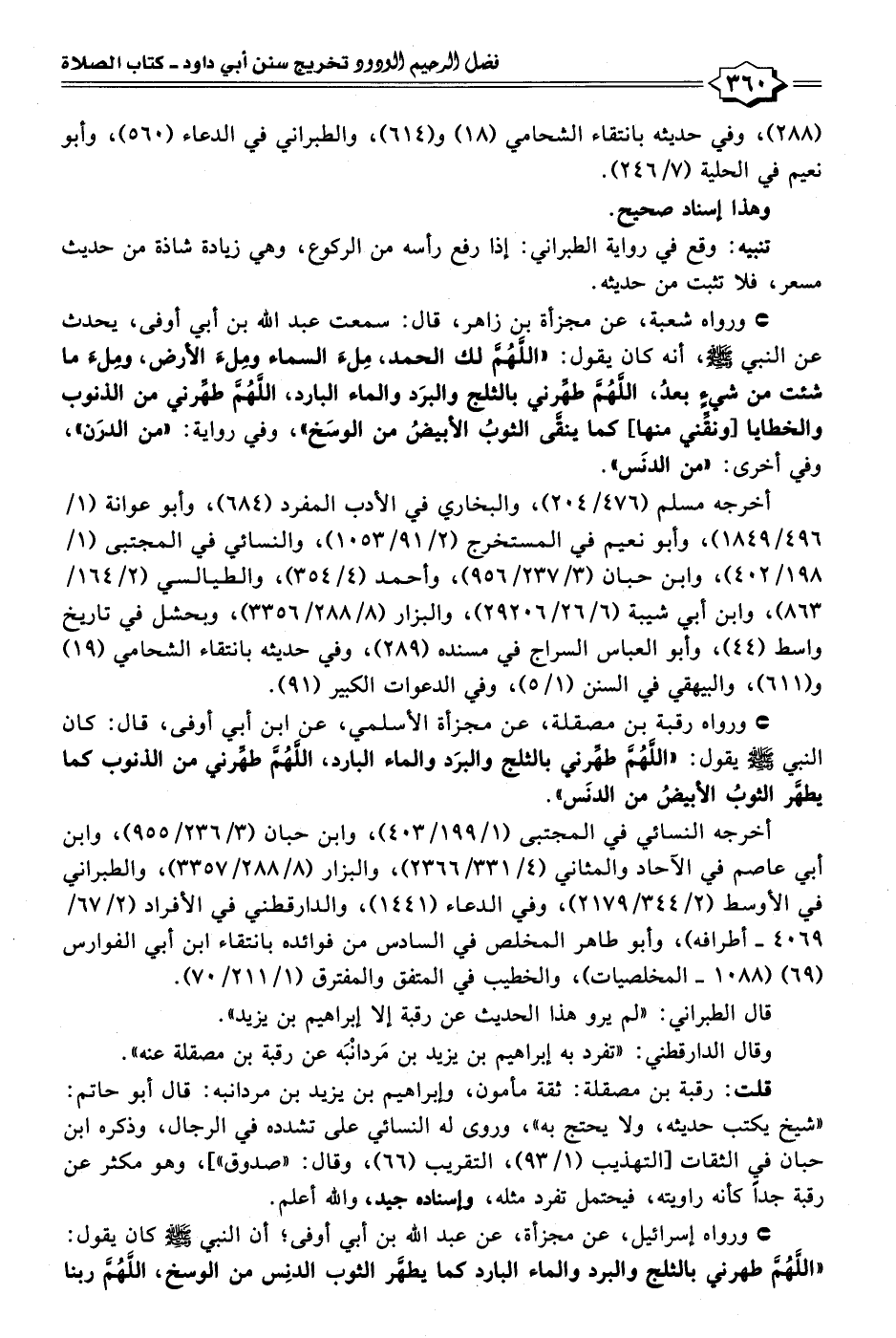 • ورواه شعبة، عن مجزأة بن زاهر، قال: سمعت عبد الله بن أبي أوفى، يحدث عن النبي - صلى الله عليه وسلم -، أنَّه كان يقول: "اللَّهُمَّ لك الحمد، مِلءَ السماء ومِلءَ الأرض، ومِلءَ ما شئت من شيءٍ بعدُ، اللَّهُمَّ طهِّرني بالثلج والبرَد والماء البارد، اللَّهُمَّ طهِّرني من الذنوب والخطايا [ونقِّني منها] كما ينقَّى الثوبُ الأبيضُ من الوسَخ"، وفي رواية: "من الدرَن"، وفي أخرى: "من الدنَس".