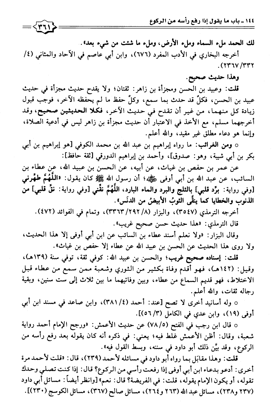 قلت: وهذا مقابَل بما رواه أبو داود في مسائله لأحمد (٢٣٩)، قال: "قلت لأحمد مرة أخرى: أدعو بدعاء ابن أبي أوفى إذا رفعت رأسي من الركوع؟ قال: إذا كنت تصلي وحدك تقوله، أو يكون الإمام يقوله، قلت: في الفريضة؟ قال: نعم" [وانظر أيضًا: مسائل أبي داود (٢٣٧ و ٢٣٨)، مسائل عبد الله (٢٦٣ و ٢٦٤)، مسائل صالح (٣٦٧)، مسائل الكوسج (٢٣٠)].