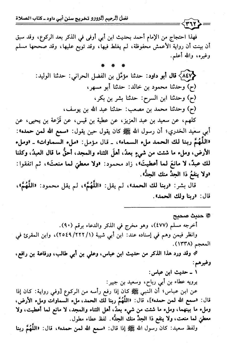 عن ابن عباس؛ أن النبي - صلى الله عليه وسلم - كان إذا رفع رأسه من الركوع [وفي رواية: كان إذا قال: "سمع الله لمن حمده"]، قال: "اللَّهُمَّ ربنا لك الحمد، ملء السماوات وملء الأرض، وملء ما بينهما، وملء ما شئت من شيء بعدُ، أهل الثناء والمجد، لا مانع لما أعطيت، ولا معطيَ لما منعت، ولا ينفع ذا الجدِّ منك الجدُّ". لفظ عطاء مطول.