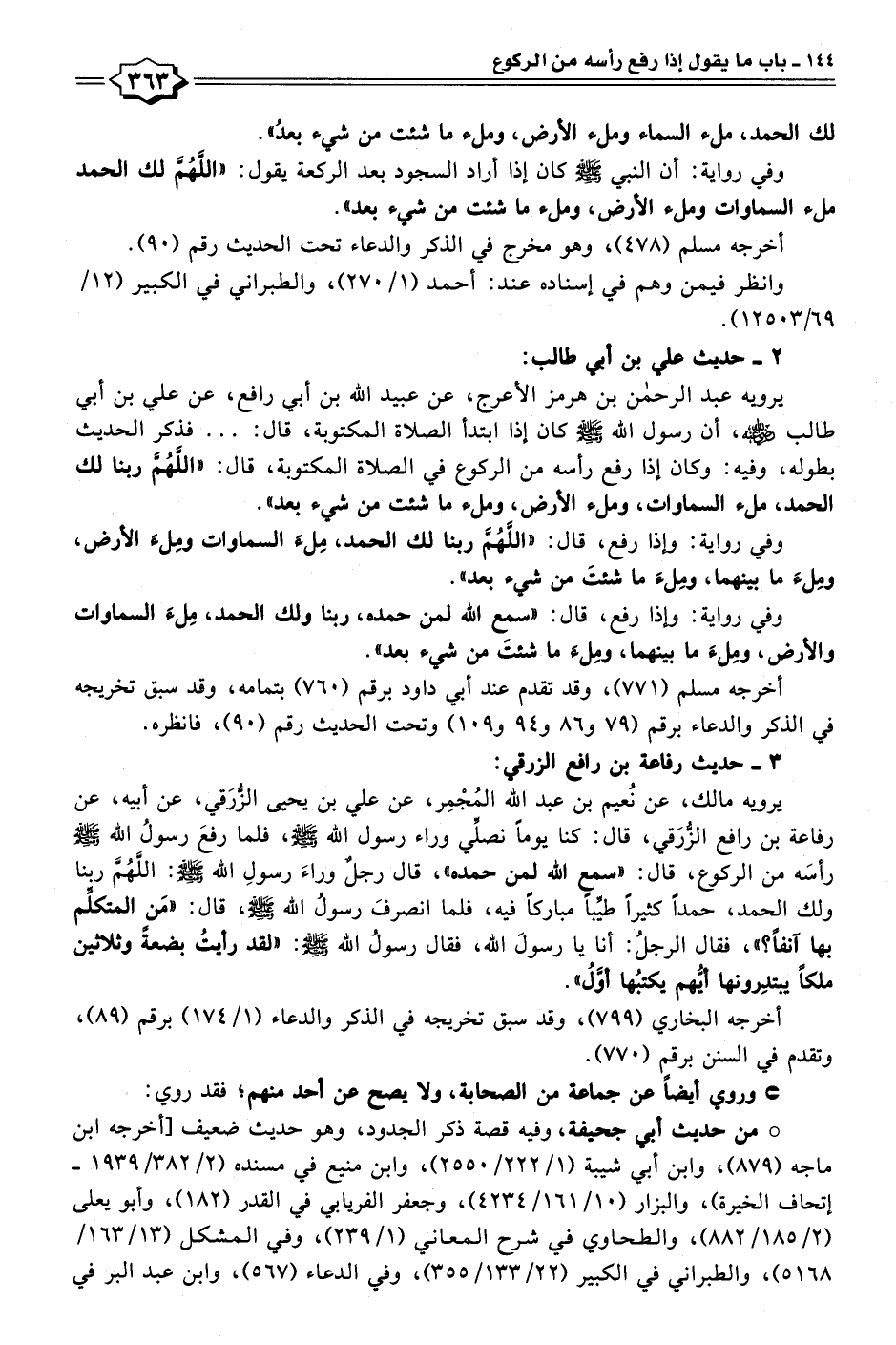 يرويه عبد الرحمن بن هرمز الأعرج، عن عبيد الله بن أبي رافع، عن علي بن أبي طالب - رضي الله عنه -، أن رسول الله - صلى الله عليه وسلم - كان إذا ابتدأ الصلاة المكتوبة، قال:. . . فذكر الحديث بطوله، وفيه: وكان إذا رفع رأسه من الركوع في الصلاة المكتوبة، قال: "اللَّهُمَّ ربنا لك الحمد، ملء السماوات، وملء الأرض، وملء ما شئت من شيء بعد".