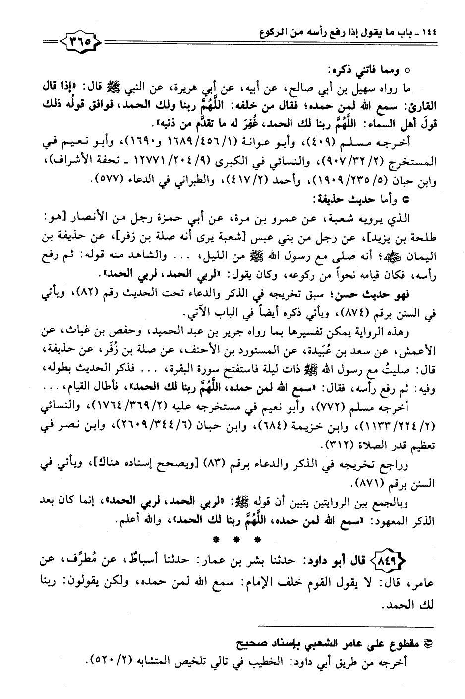 ٨٤٩ - قال أبو داود: حدثنا بشر بن عمار: حدثنا أسباطٌ، عن مُطرِّف، عن عامر، قال: لا يقول القوم خلف الإمام: سمع الله لمن حمده، ولكن يقولون: ربنا لك الحمد.