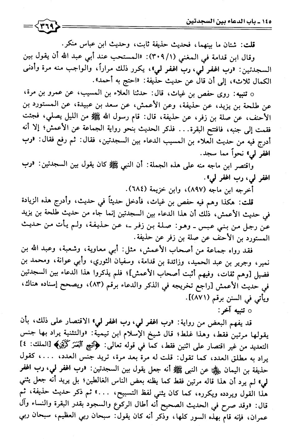 وقال ابن قدامة في المغني (١/ ٣٠٩): "المستحب عند أبي عبد الله أن يقول بين السجدتين: "رب اغفر لي، رب اغفر لي"، يكرر ذلك مرارًا، والواجب منه مرة وأدنى الكمال ثلاث"، إلى أن قال عن حديث حذيفة: "احتج به أحمد".
