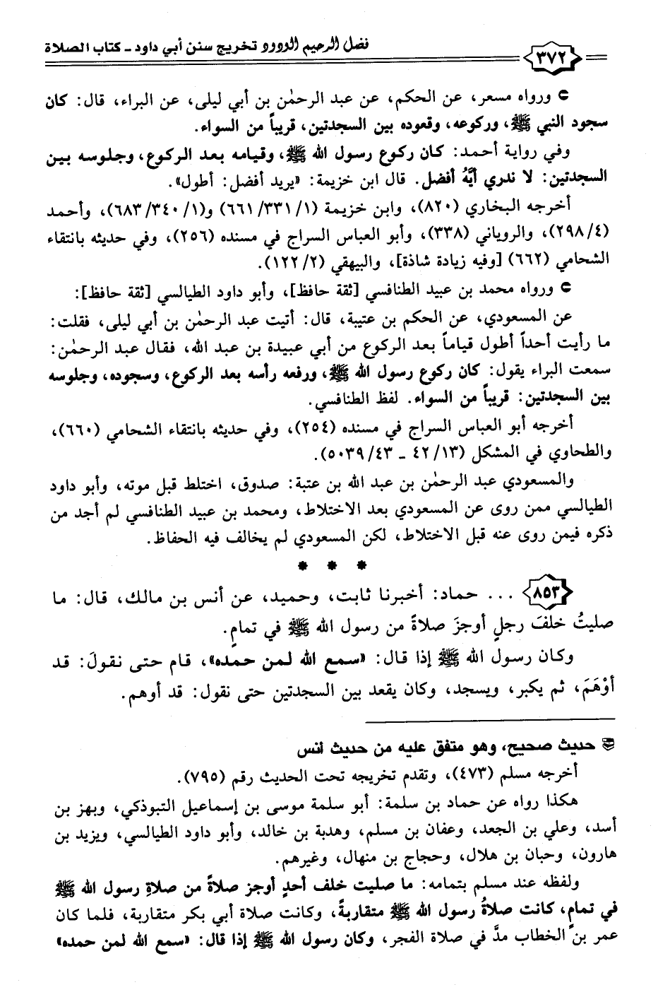 عن المسعودي، عن الحكم بن عتيبة، قال: أتيت عبد الرحمن بن أبي ليلى، فقلت: ما رأيت أحدًا أطول قيامًا بعد الركوع من أبي عبيدة بن عبد الله، فقال عبد الرحمن: سمعت البراء يقول: كان ركوع رسول الله - صلى الله عليه وسلم -، ورفعه رأسه بعد الركوع، وسجوده، وجلوسه بين السجدتين: قريبًا من السواء. لفظ الطنافسي.