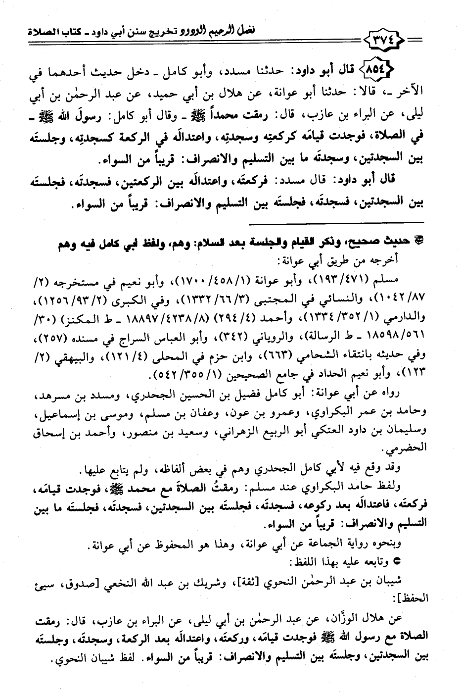 ٨٥٤ - قال أبو داود: حدثنا مسدد، وأبو كامل - دخل حديث أحدهما في الآخر -، قالا: حدثنا أبو عوانة، عن هلال بن أبي حميد، عن عبد الرحمن بن أبي ليلى، عن البراء بن عازب، قال: رمقت محمدًا - صلى الله عليه وسلم - وقال أبو كامل: رسولَ الله - صلى الله عليه وسلم - في الصلاة، فوجدت قيامَه كركعتِه وسجدتِه، واعتدالَه في الركعة كسجدتِه، وجلستَه بين السجدتين، وسجدتَه ما بين التسليم والانصراف: قريبًا من السواء.