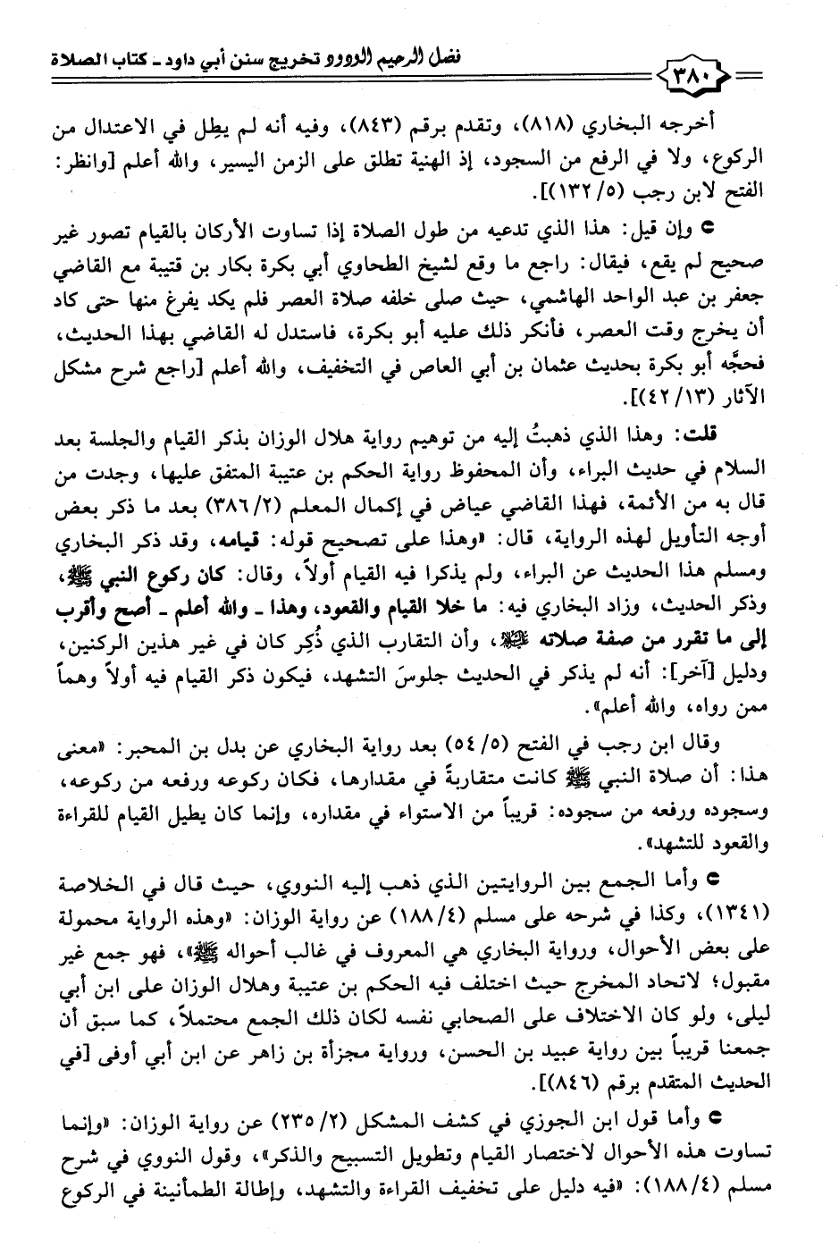 وقال ابن رجب في الفتح (٥/ ٥٤) بعد رواية البخاري عن بدل بن المحبر: "معنى هذا: أن صلاة النبي - صلى الله عليه وسلم - كانت متقاربةً في مقدارها، فكان ركوعه ورفعه من ركوعه، وسجوده ورفعه من سجوده: قريبًا من الاستواء في مقداره، وإنما كان يطيل القيام للقراءة والقعود للتشهد".