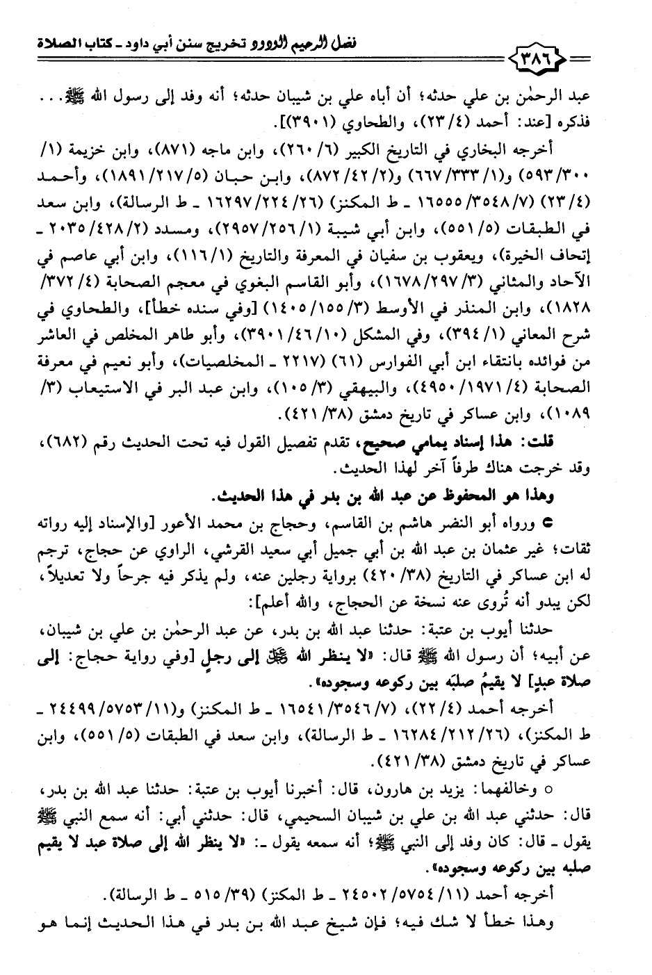 • وخالفهما: يزيد بن هارون، قال: أخبرنا أيوب بن عتبة: حدثنا عبد الله بن بدر، قال: حدثني عبد الله بن علي بن شيبان السحيمي، قال: حدثني أبي: أنَّه سمع النبي - صلى الله عليه وسلم - يقول - قال: كان وفد إلى النبي - صلى الله عليه وسلم -؛ أنَّه سمعه يقول -: "لا ينظر الله إلى صلاة عبد لا يقيم صلبه بين ركوعه وسجوده".