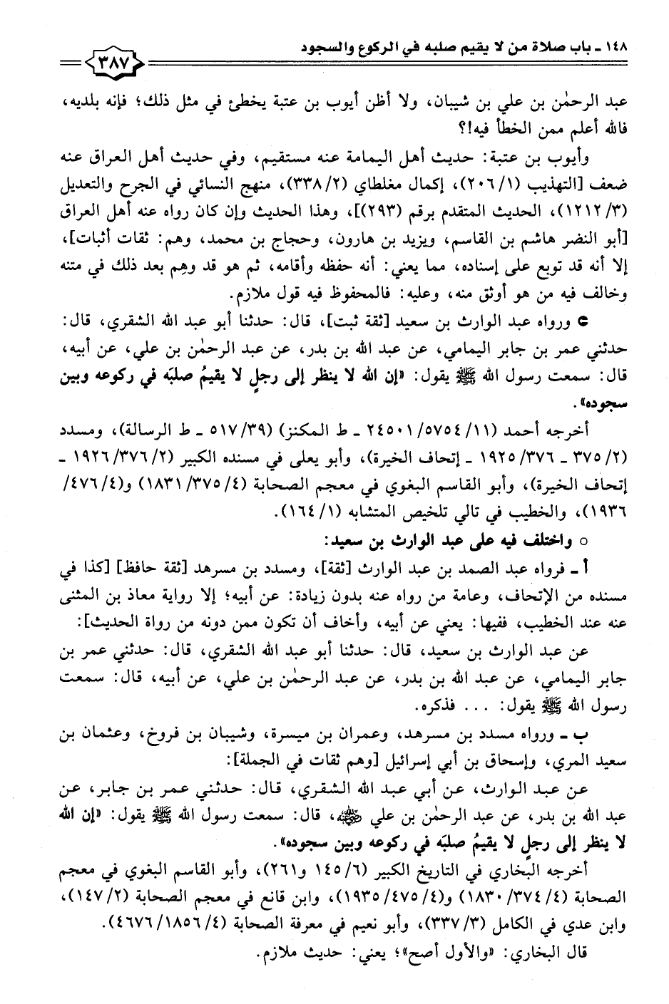 • ورواه عبد الوارث بن سعيد [ثقة ثبت]، قال: حدثنا أبو عبد الله الشقري، قال: حدثني عمر بن جابر اليمامي، عن عبد الله بن بدر، عن عبد الرحمن بن علي، عن أبيه، قال: سمعت رسول الله - صلى الله عليه وسلم - يقول: "إن الله لا ينظر إلى رجلٍ لا يقيمُ صلبَه في ركوعه وبين سجوده".