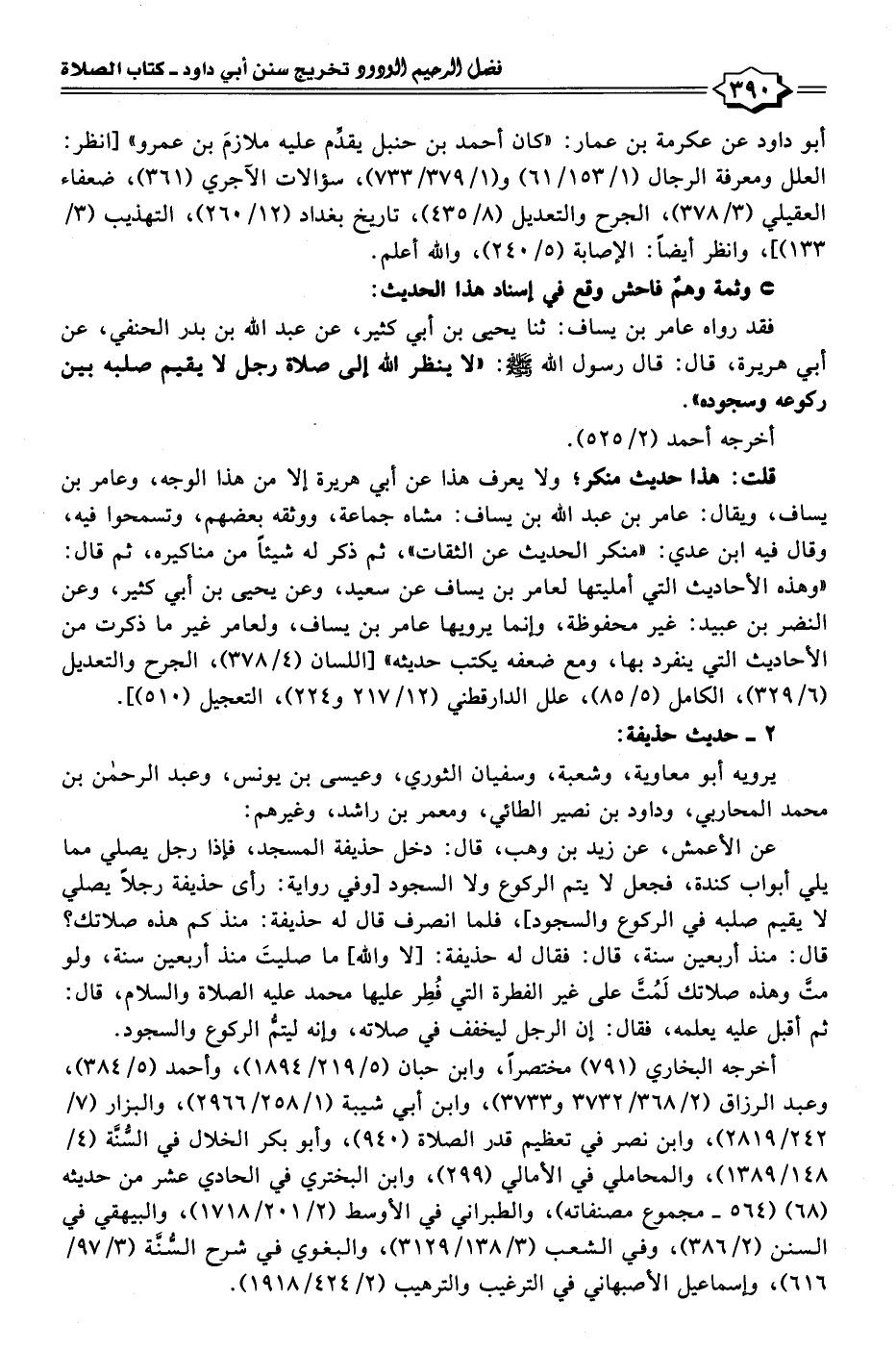 فقد رواه عامر بن يساف: ثنا يحيى بن أبي كثير، عن عبد الله بن بدر الحنفي، عن أبي هريرة، قال: قال رسول الله - صلى الله عليه وسلم -: "لا ينظر الله إلى صلاة رجل لا يقيم صلبه بين ركوعه وسجوده".
