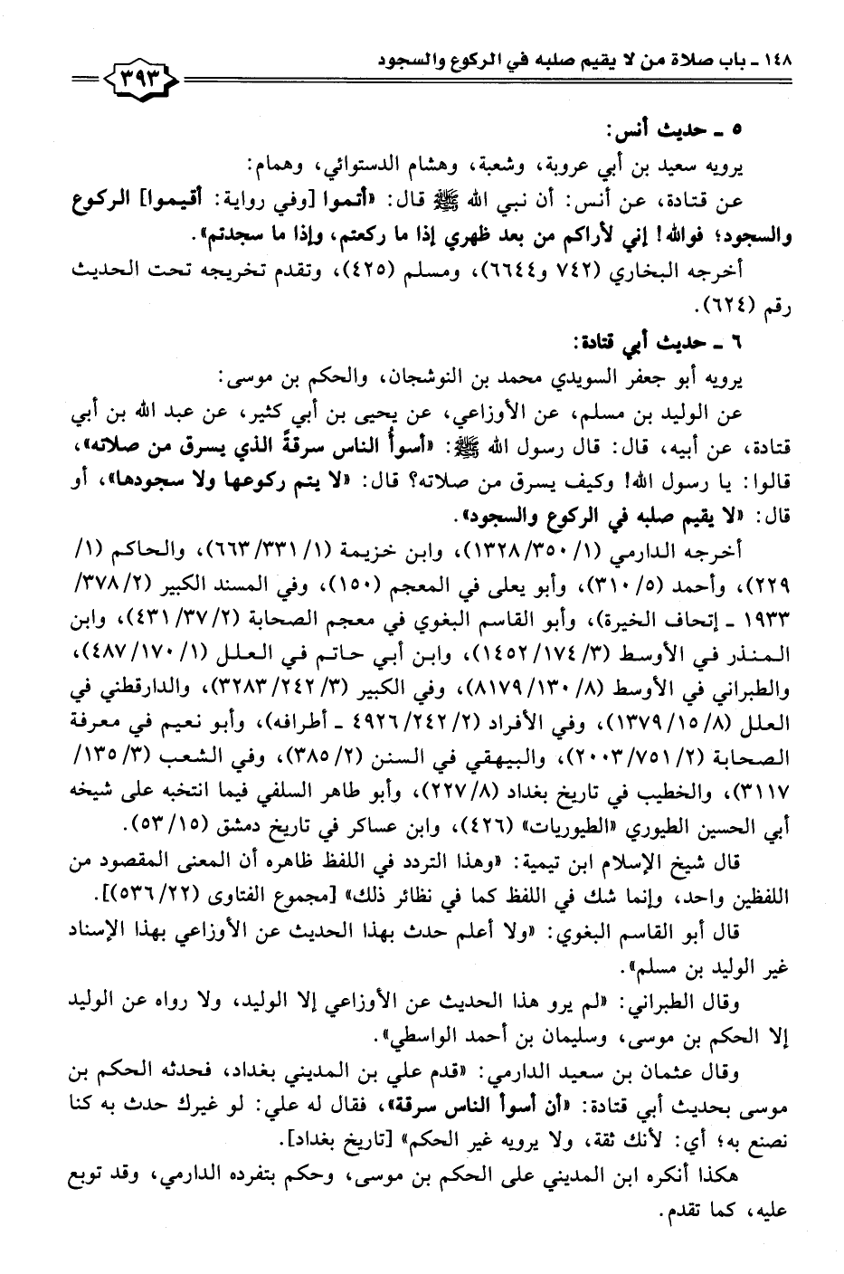 عن الوليد بن مسلم، عن الأوزاعي، عن يحيى بن أبي كثير، عن عبد الله بن أبي قتادة، عن أبيه، قال: قال رسول الله - صلى الله عليه وسلم -: "أسوأُ الناس سرقةً الذي يسرق من صلاته"، قالوا: يا رسول الله! وكيف يسرق من صلاته؟ قال: "لا يتم ركوعها ولا سجودها"، أو قال: "لا يقيم صلبه في الركوع والسجود".