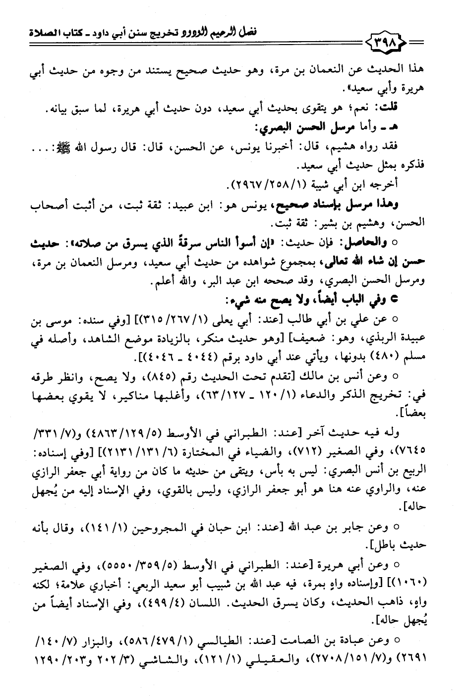 • والحاصل: فإن حديث: "إن أسوأ الناس سرقةً الذي يسرق من صلاته": حديث حسن إن شاء الله تعالى، بمجموع شواهده من حديث أبي سعيد، ومرسل النعمان بن مرة، ومرسل الحسن البصري، وقد صححه ابن عبد البر، والله أعلم.