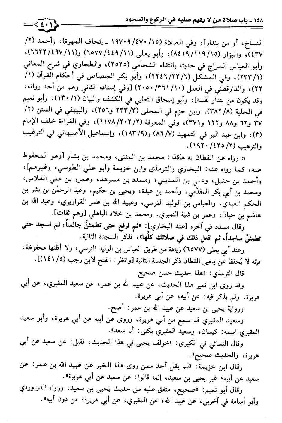 وقال مسدد في آخره [عند البخاري]: "ثمَّ ارفع حتى تطمئنَّ جالسًا، ثمَّ اسجد حتى تطمئنَّ ساجدًا، ثمَّ افعل ذلك في صلاتك كلِّها"، فذكر السجدة الثانية.