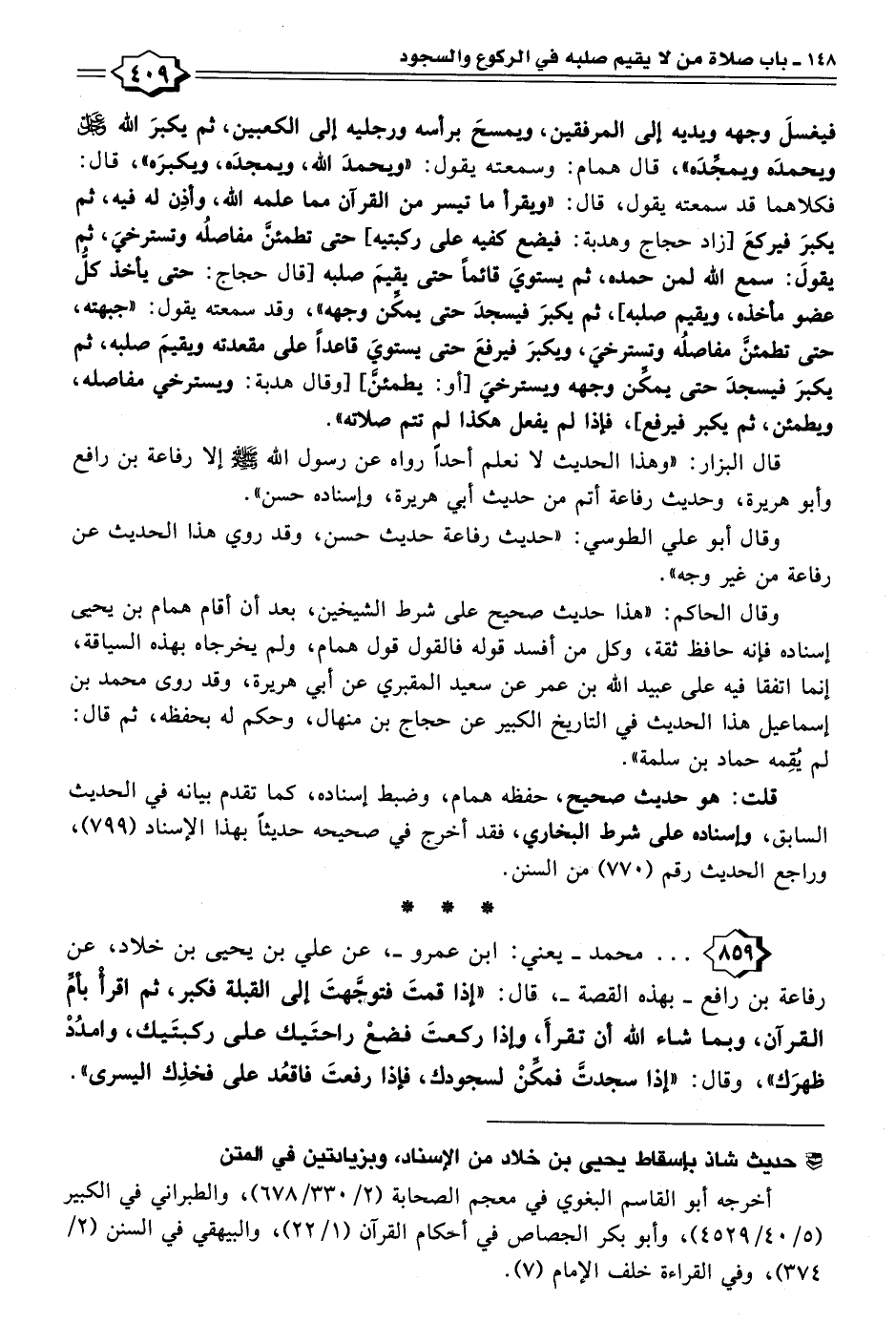 ٨٥٩ - . . . محمَّد -يعني: ابن عمرو-، عن علي بن يحيى بن خلاد، عن رفاعة بن رافع - بهذه القصة -، قال: "إذا قمتَ فتوجَّهتَ إلى القبلة فكبر، ثمَّ اقرأْ بأمِّ القرآن، وبما شاء الله أن تقرأَ، وإذا ركعتَ فضعْ راحتَيك على ركبتَيك، وامدُدْ ظهرَك"، وقال: "إذا سجدتَّ فمكَّنْ لسجودك، فإذا رفعتَ فاقعُد على فخذِك اليسرى".