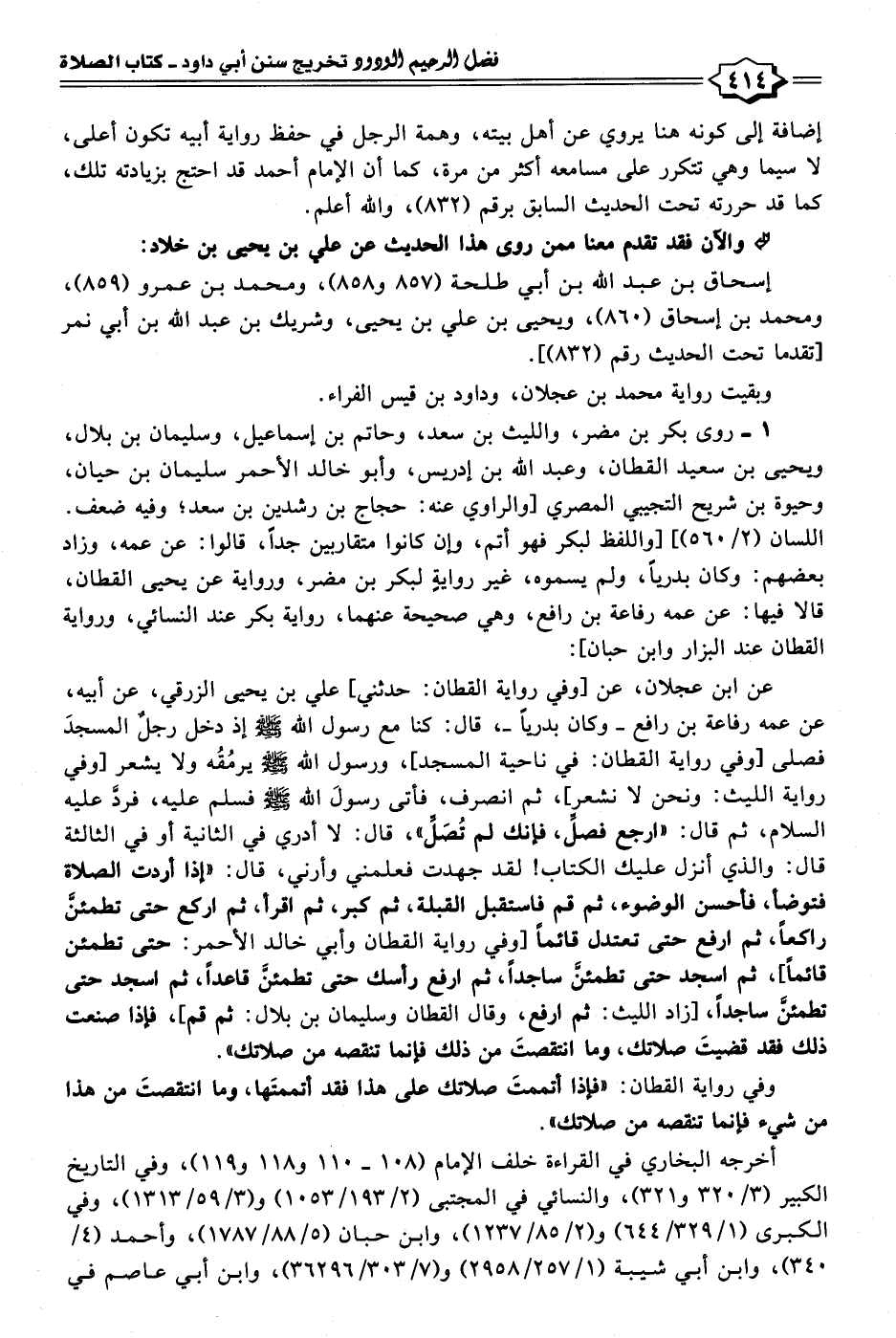 عن ابن عجلان، عن [وفي رواية القطان: حدثني] علي بن يحيى الزرقي، عن أبيه، عن عمه رفاعة بن رافع - وكان بدريًّا -، قال: كنا مع رسول الله - صلى الله عليه وسلم - إذ دخل رجلٌ المسجدَ فصلى [وفي رواية القطان: في ناحية المسجد]، ورسول الله - صلى الله عليه وسلم - يرمُقُه ولا يشعر [وفي رواية الليث: ونحن لا نشعر]، ثمَّ انصرف، فأتى رسولَ الله - صلى الله عليه وسلم - فسلم عليه، فردَّ عليه السلام، ثمَّ قال: "ارجع فصلِّ، فإنك لم تُصَلِّ"، قال: لا أدري في الثانية أو في الثالثة قال: والذي أنزل عليك الكتاب! لقد جهدت فعلمني وأرني، قال: "إذا أردت الصلاة فتوضأ، فأحسن الوضوء، ثمَّ قم فاستقبل القبلة، ثمَّ كبر، ثمَّ اقرأ، ثمَّ اركع حتى تطمئنَّ راكعًا، ثمَّ ارفع حتى تعتدل قائمًا [وفي رواية القطان وأبي خالد الأحمر: حتى تطمئن قائمًا]، ثمَّ اسجد حتى تطمئنَّ ساجدًا، ثمَّ ارفع رأسك حتى تطمئنَّ قاعدًا، ثمَّ اسجد حتى تطمئنَّ ساجدًا، [زاد الليث: ثمَّ ارفع، وقال القطان وسليمان بن بلال: ثمَّ قم]، فإذا صنعت ذلك فقد قضيتَ صلاتك، وما انتقصتَ من ذلك فإنما تنقصه من صلاتك".