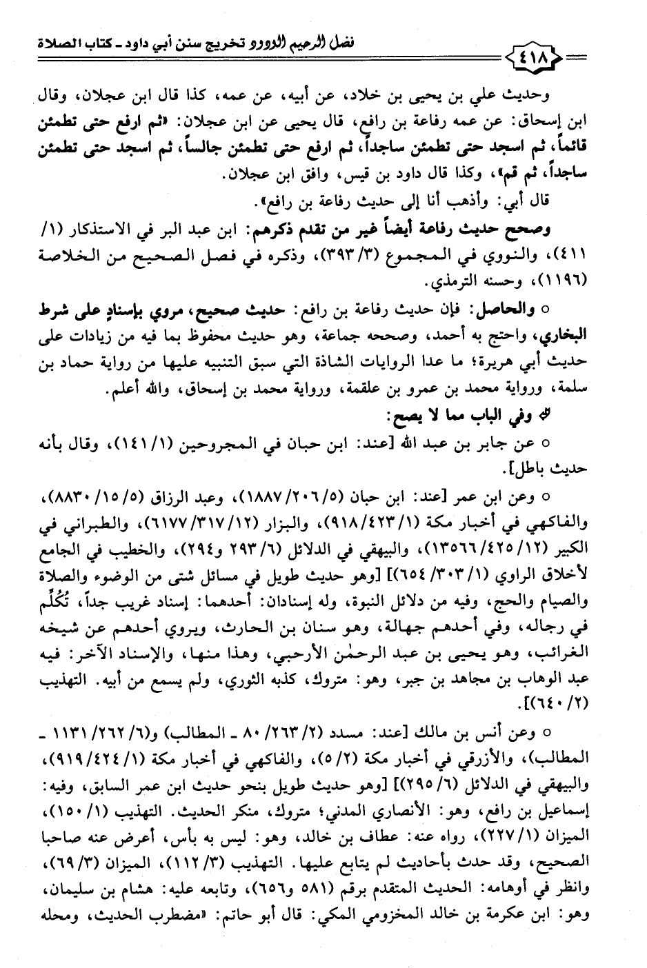وصحح حديث رفاعة أيضًا غير من تقدم ذكرهم: ابن عبد البر في الاستذكار (١/ ٤١١)، والنووي في المجموع (٣/ ٣٩٣)، وذكره في فصل الصحيح من الخلاصة (١١٩٦)، وحسنه الترمذي.