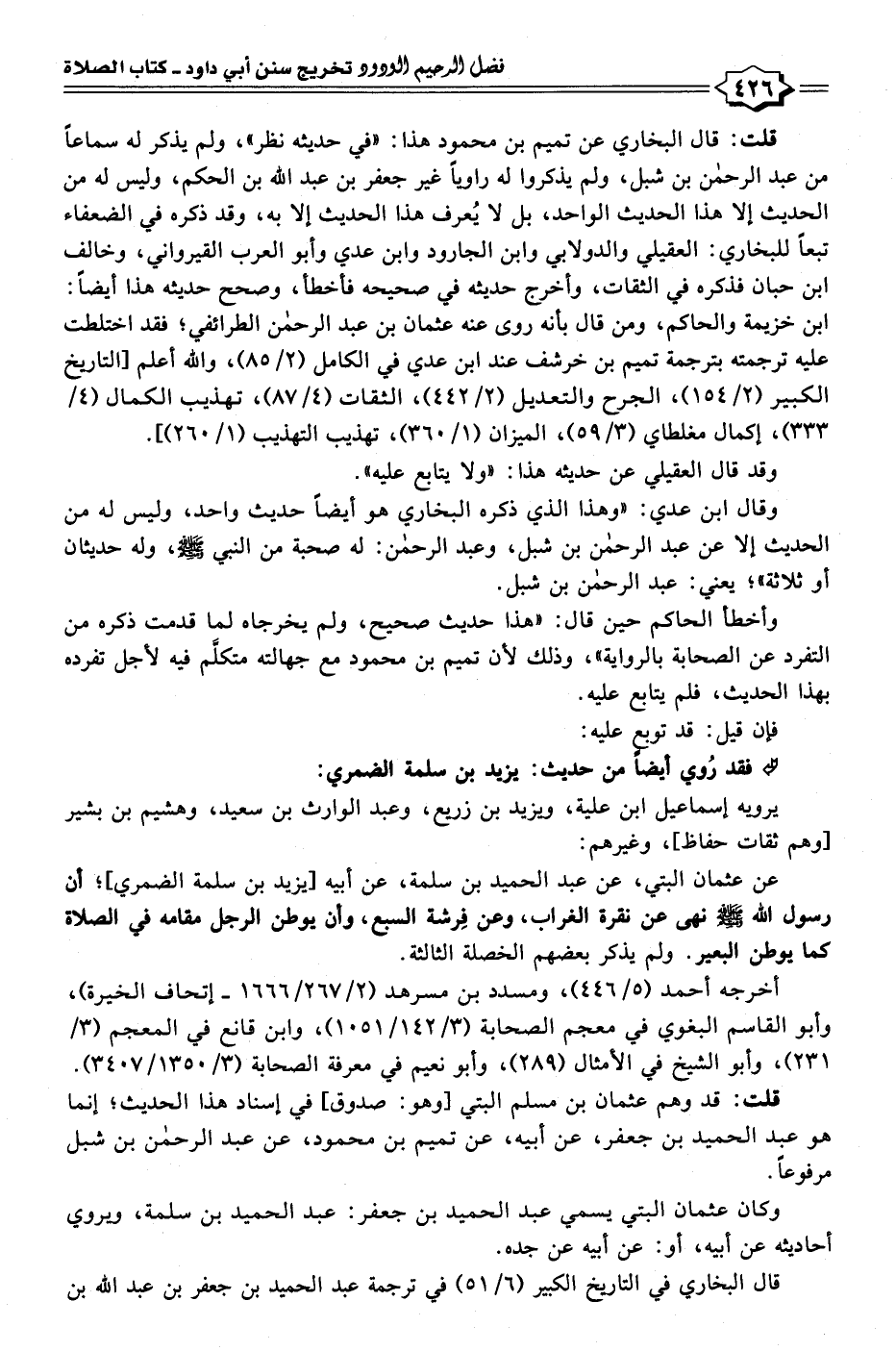 قلت: قد وهم عثمان بن مسلم البتي [وهو: صدوق] في إسناد هذا الحديث؛ إنما هو عبد الحميد بن جعفر، عن أبيه، عن تميم بن محمود، عن عبد الرحمن بن شبل مرفوعًا.
