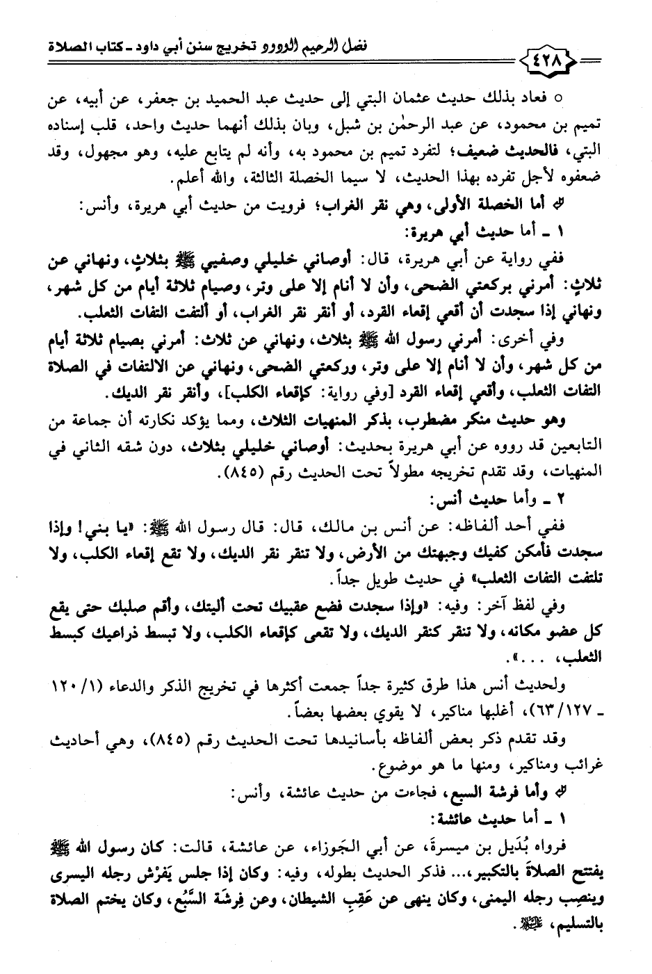أما الخصلة الأولى، وهي نقر الغراب؛ فرويت من حديث أبي هريرة، وأنس:
