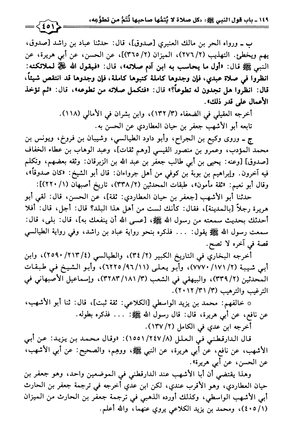 ب - ورواه الحر بن مالك العنبري [صدوق]، قال: حدثنا عباد بن راشد [صدوق، يهم ويخطئ. التهذيب (٢/ ٢٧٦)، الميزان (٢/ ٣٦٥)]، عن الحسن، عن أبي هريرة، عن النبي - صلى الله عليه وسلم - قال: "أول ما يحاسب به ابن آدم صلاته"، قال: "فيقول الله - جل جلاله - لملائكته: انظروا في صلاة عبدي، فإن وجدوها كاملة كتبوها كاملة، فإن وجدوها قد انتقص شيئًا، قال: انظروا هل تجدون له تطوعًا؟ " قال: "فتكمل صلاته من تطوعه"، قال: "ثمَّ تؤخذ الأعمال على قدر ذلك".