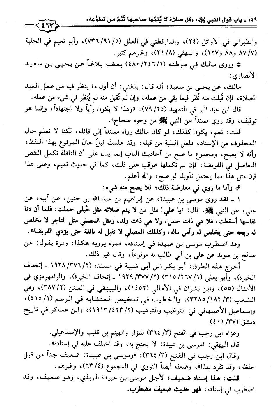 ١ - فقد روى موسى بن عبيدة، عن إبراهيم بن عبد الله بن حنين، عن أبيه، عن علي، عن النبي - صلى الله عليه وسلم -، قال: "يا علي! مثل من لا يتم صلاته مثل حُبلى حملت، فلما أن دنا نفاسها أسقطت، فلا هي ذات حمل، ولا هي ذات ولد، ومثل المصلي مثل التاجر لا يخلص له ربحه حتى يخلص له رأس ماله، وكذلك المصلي لا تقبل له نافلة حتى يؤدي الفريضة".