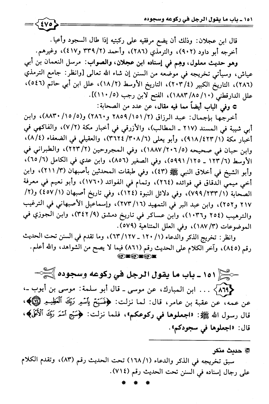 ٨٦٩ - . . . ابن المبارك، عن موسى -قال أبو سلمة: موسى بن أيوب-، عن عمه، عن عقبة بن عامر، قال: لما نزلت: {فَسَبِّحْ بِاسْمِ رَبِّكَ الْعَظِيمِ (٧٤)}، قال رسول الله - صلى الله عليه وسلم -: "اجعلوها في ركوعكم"، فلما نزلت: {سَبِّحِ اسْمَ رَبِّكَ الْأَعْلَى}، قال: "اجعلوها في سجودكم".