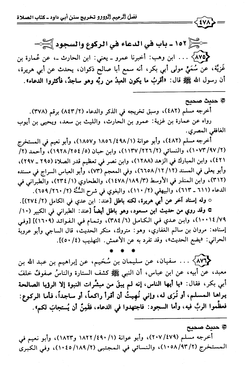 ٨٧٥ - . . . ابن وهب: أخبرنا عمرو -يعني: ابن الحارث-، عن عُمارة بن غَزيَّة، عن سُمَيِّ مولى أبي بكر، أنه سمع أبا صالح ذكوان، يحدث عن أبي هريرة، أن رسول الله - صلى الله عليه وسلم - قال: "أقربُ ما يكون العبدُ من ربِّه وهو ساجدٌ، فأكثروا الدعاء".
