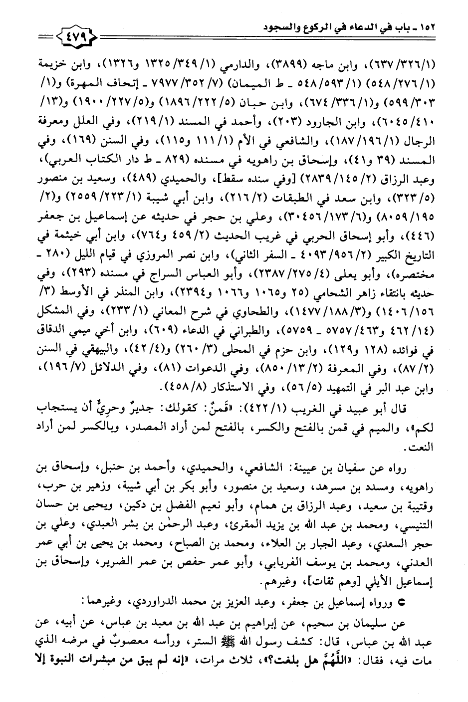 (١/ ٣٢٦/ ٦٣٧)، وابن ماجه (٣٨٩٩)، والدارمي (١/ ٣٤٩/ ١٣٢٥ و ١٣٢٦)، وابن خزبمة (١/ ٢٧٦/ ٥٤٨) (١/ ٥٩٣/ ٥٤٨ - ط الميمان) (٧/ ٣٥٢/ ٧٩٧٧ - إتحاف المهرة) و (١/ ٣٠٣/ ٥٩٩) و (١/ ٣٣٦/ ٦٧٤)، وابن حبان (٥/ ١٨٩٦/٢٢٢) و (٥/ ٢٢٧/ ١٩٠٠) و (١٣/ ٤١٠/ ٦٠٤٥)، وابن الجارود (٢٠٣)، وأحمد في المسند (١/ ٢١٩)، وفي العلل ومعرفة الرجال (١/ ١٩٦ / ١٨٧)، والشافعي في الأم (١/ ١١١ و ١١٥)، وفي السنن (١٦٩)، وفي المسند (٣٩ و ٤١)، وإسحاق بن راهويه في مسنده (٨٢٩ - ط دار الكتاب العربي)، وعبد الرزاق (٢/ ١٤٥/ ٢٨٣٩) [وفي سنده سقط]، والحميدي (٤٨٩)، وسعيد بن منصور (٥/ ٣٢٣)، وابن سعد في الطبقات (٢/ ٢١٦)، وابن أبي شيبة (١/ ٢٢٣/ ٢٥٥٩) و (٢/ ١٩٥/ ٨٠٥٩) و (٦/ ١٧٣/ ٣٠٤٥٦)، وعلي بن حجر في حديثه عن إسماعيل بن جعفر (٤٤٦)، وأبو إسحاق الحربي في غريب الحديث (٢/ ٤٥٩ و ٧٦٤)، وابن أبي خيثمة في التاريخ الكبير (٢/ ٩٥٦/ ٤٠٩٣ - السفر الثاني)، وابن نصر المروزي في قيام الليل (٢٨٠ - مختصره)، وأبو يعلى (٤/ ٢٧٥/ ٢٣٨٧)، وأبو العباس السراج في مسنده (٢٩٣)، وفي حديثه بانتقاء زاهر الشحامي (٢٥ و ١٠٦٥ و ١٠٦٦ و ٢٣٩٤)، وابن المنذر في الأوسط (٣/ ١٥٦/ ١٤٠٦) و (٣/ ١٨٨/ ١٤٧٧)، والطحاوي في شرح المعاني (١/ ٢٣٣)، وفي المشكل (١٤/ ٤٦٢ و ٤٦٣/ ٥٧٥٧ - ٥٧٥٩)، والطبراني في الدعاء (٦٠٩)، وابن أخي ميمي الدقاق في فوائده (١٢٨ و ١٢٩)، وابن حزم في المحلى (٣/ ٢٦٠) و (٤/ ٤٢)، والبيهقي في السنن (٢/ ٨٧)، وفي المعرفة (٢/ ١٣/ ٨٥٠)، وفي الدعوات (٨١)، وفي الدلائل (٧/ ١٩٦)، وابن عبد البر في التمهيد (٥/ ٥٦)، وفي الاستذكار (٨/ ٤٥٨).