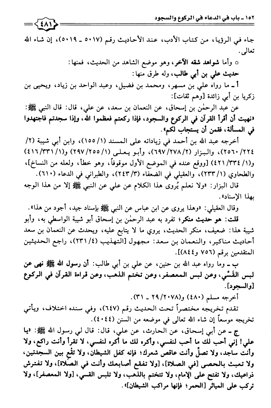عن عبد الرحمن بن إسحاق، عن النعمان بن سعد، عن علي، قال: قال النبي - صلى الله عليه وسلم -: "نهيت أن أقرأ القرآن في الركوع والسجود، فإذا ركعتم فعظموا الله، وإذا سجدتم فاجتهدوا في المسألة، فقمن أن يستجاب لكم".