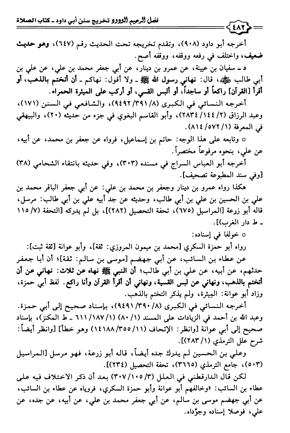 د - سفيان بن عيينة، عن عمرو بن دينار، عن أبي جعفر محمد بن علي، عن علي بن أبي طالب - رضي الله عنه -، قال: نهاني رسول الله - صلى الله عليه وسلم - - ولا أقول: نهاكم- أن أتختم بالذهب، أو أقرأ [القرآن] راكعًا أو ساجدًا، أو ألبس القسي، أو أركب على الميثرة الحمراء.