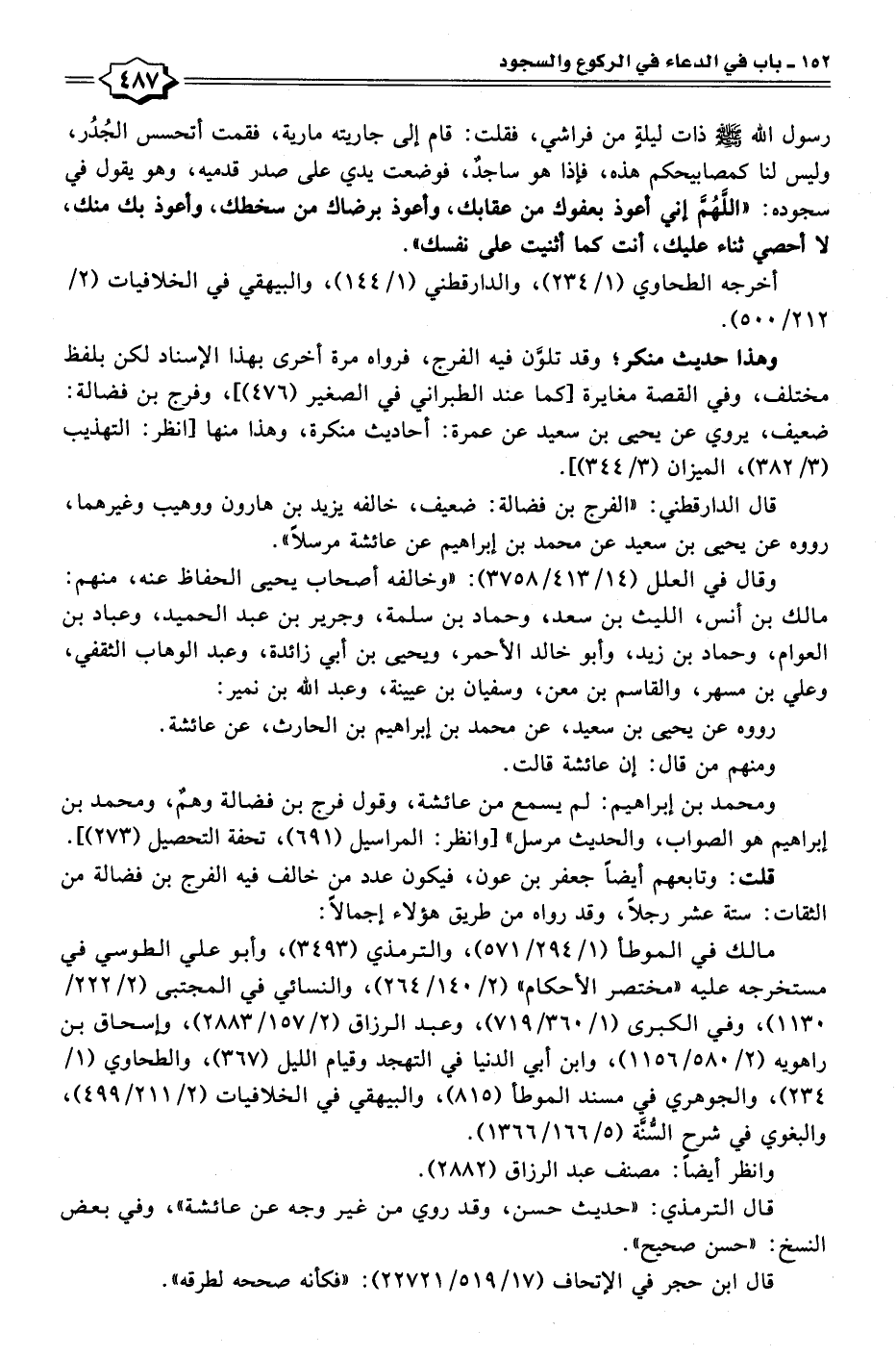 رسول الله - صلى الله عليه وسلم - ذات ليلةٍ من فراشي، فقلت: قام إلى جاريته مارية، فقمت أتحسس الجُدُر، وليس لنا كمصابيحكم هذه، فإذا هو ساجدٌ، فوضعت يدي على صدر قدميه، وهو يقول في سجوده: "اللَّهُمَّ إني أعوذ بعفوك من عقابك، وأعوذ برضاك من سخطك، وأعوذ بك منك، لا أحصي ثناء عليك، أنت كما أثنيت على نفسك".