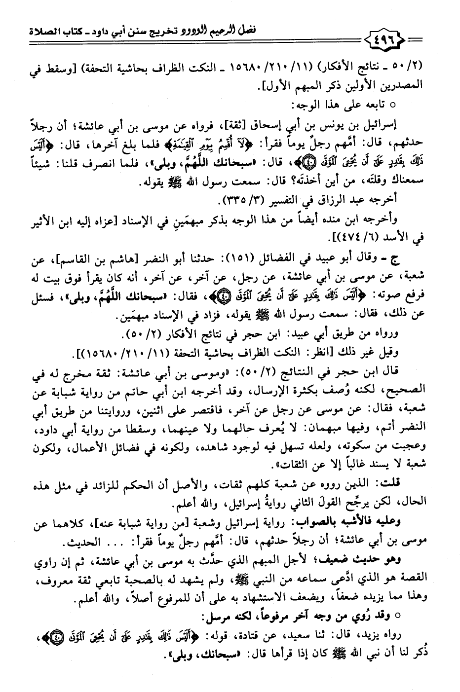 ج - وقال أبو عبيد في الفضائل (١٥١): حدثنا أبو النضر [هاشم بن القاسم]، عن شعبة، عن موسى بن أبي عائشة، عن رجل، عن آخر، عن آخر، أنه كان يقرأ فوق بيت له فرفع صوته: {أَلَيْسَ ذَلِكَ بِقَادِرٍ عَلَى أَنْ يُحْيِيَ الْمَوْتَى (٤٠)}، فقال: "سبحانك اللَّهُمَّ، وبلى"، فسئل عن ذلك، فقال: سمعت رسول الله - صلى الله عليه وسلم - يقوله، فزاد في الإسناد مبهمَين.