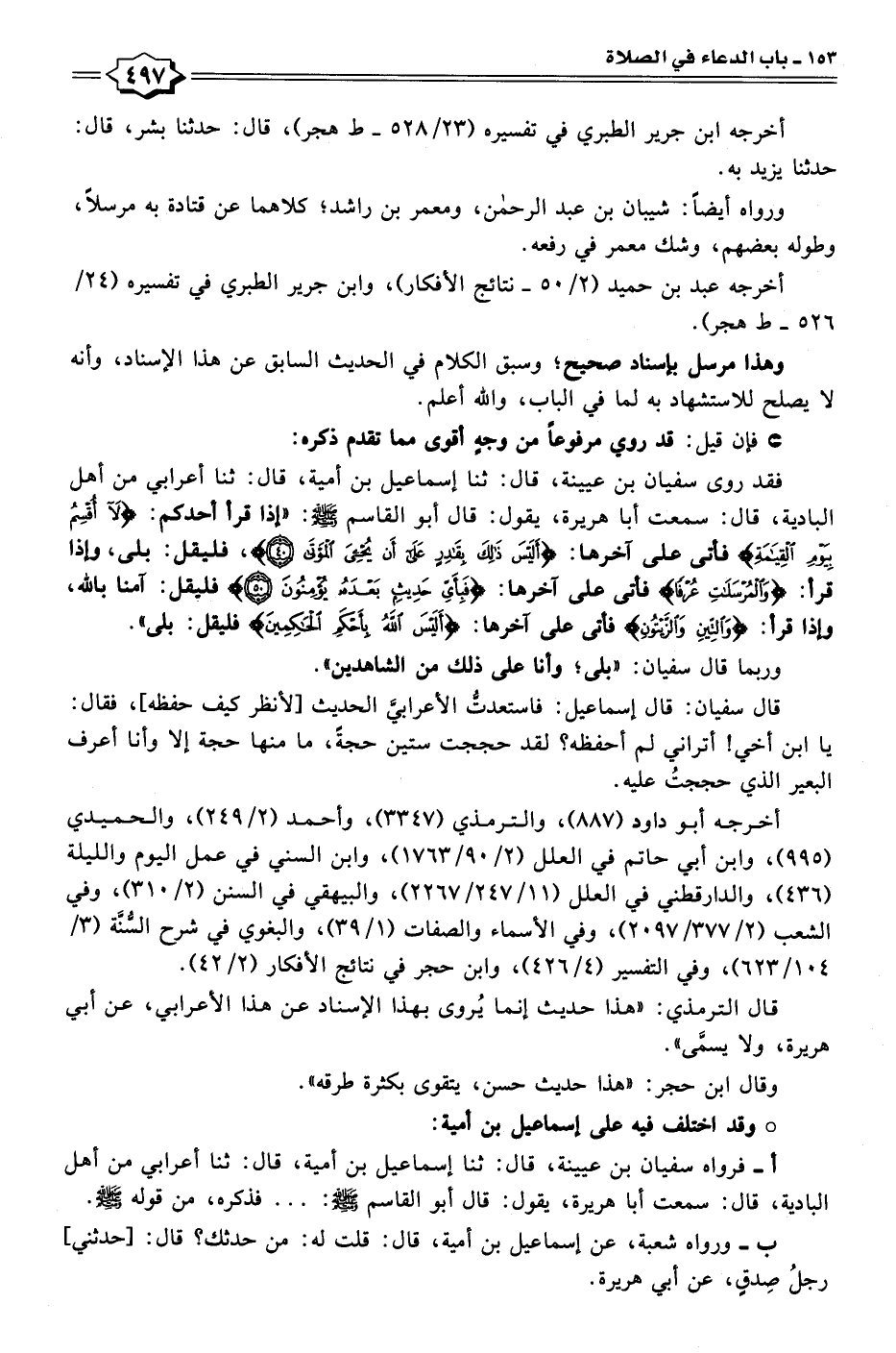 أخرجه أبو داود (٨٨٧)، والترمذي (٣٣٤٧)، وأحمد (٢/ ٢٤٩)، والحميدي (٩٩٥)، وابن أبي حاتم في العلل (٢/ ٩٠/ ١٧٦٣)، وابن السني في عمل اليوم والليلة (٤٣٦)، والدارقطني في العلل (١١/ ٢٤٧/ ٢٢٦٧)، والبيهقي في السنن (٢/ ٣١٠)، وفي الشعب (٢/ ٣٧٧/ ٢٠٩٧)، وفي الأسماء والصفات (١/ ٣٩)، والبغوي في شرح السُّنَّة (٣/ ١٠٤/ ٦٢٣)، وفي التفسير (٤/ ٤٢٦)، وابن حجر في نتائج الأفكار (٢/ ٤٢).