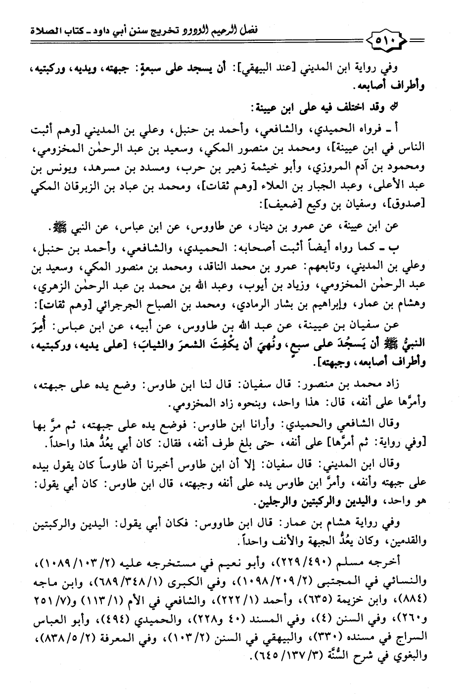وقال ابن المديني: قال سفيان: إلا أن ابن طاوس أخبرنا أن طاوسًا كان يقول بيده على جبهته وأنفه، وأمرَّ ابن طاوس يده على أنفه وجبهته، قال ابن طاوس: كان أبي يقول: هو واحد، واليدين والركبتين والرجلين.