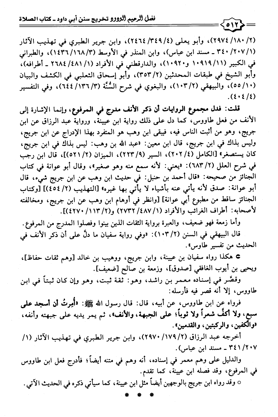 قلت: فدل مجموع الروايات أن ذكر الأنف مدرج في المرفوع، وإنما الإشارة إلى الأنف من فعل طاووس، كما دل على ذلك رواية ابن عيينة، ورواية عبد الرزاق عن ابن جريج، وهو من أثبت الناس فيه، فيبقى ابن وهب هو المتفرد بهذا الإدراج عن ابن جريج، وليس بذاك في ابن جريج، قال ابن معين: "عبد الله بن وهب: ليس بذاك في ابن جريج، كان يستصغر" [الكامل (٤/ ٢٠٢)، السير (٩/ ٢٢٣)، الميزان (٢/ ٥٢١)]، قال ابن رجب في شرح العلل (٢/ ٦٨٣): "يعني: لأنه سمع منه وهو صغير"، وقال أبو عوانة في كتاب الجنائز من صحيحه: "قال أحمد بن حنبل: في حديث ابن وهب عن ابن جريج شيء، قال أبو عوانة: صدق لأنه يأتي عنه بأشياء لا يأتي بها غيره" [التهذيب (٢/ ٤٥٤)] [وكتاب الجنائز ساقط من مطبوع أبي عوانة] [وانظر في أوهام ابن وهب عن ابن جريج، ومخالفته لأصحابه: أطراف الغرائب والأفراد (١/ ٤٨٧/ ٢٧٣٢) و (٢/ ١١٣/ ٤٢٧٠)].