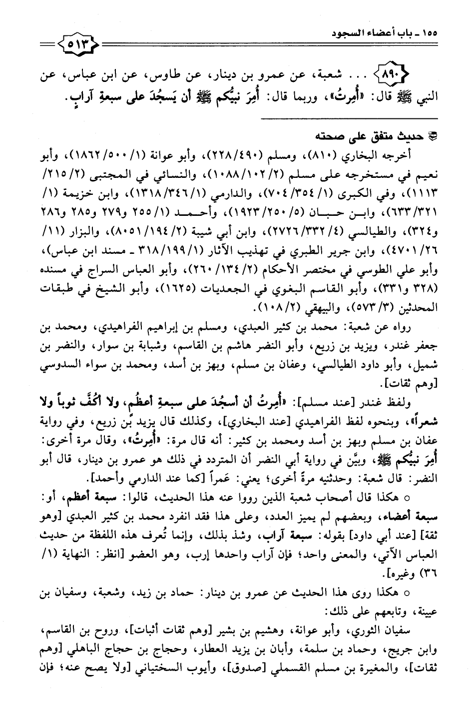 ٨٩٠ - . . . شعبة، عن عمرو بن دينار، عن طاوس، عن ابن عباس، عن النبي - صلى الله عليه وسلم - قال: "أُمِرتُ"، وربما قال: أُمِرَ نبيُّكم - صلى الله عليه وسلم - أن يَسجُدَ على سبعةِ آرابٍ.