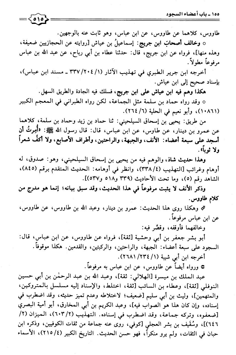 من طريق: يحيى بن إسحاق السيلحيني: ثنا حماد بن زيد وحماد بن سلمة، كلاهما عن عمرو بن دينار، عن طاوس، عن ابن عباس، قال: قال رسول الله - صلى الله عليه وسلم -: "أُمِرتُ أن أسجد على سبعة أعضاء: الأنف، والجبهة، والراحتين، وأطراف الأصابع، ولا أكفَّ شعرًا ولا ثوبًا".