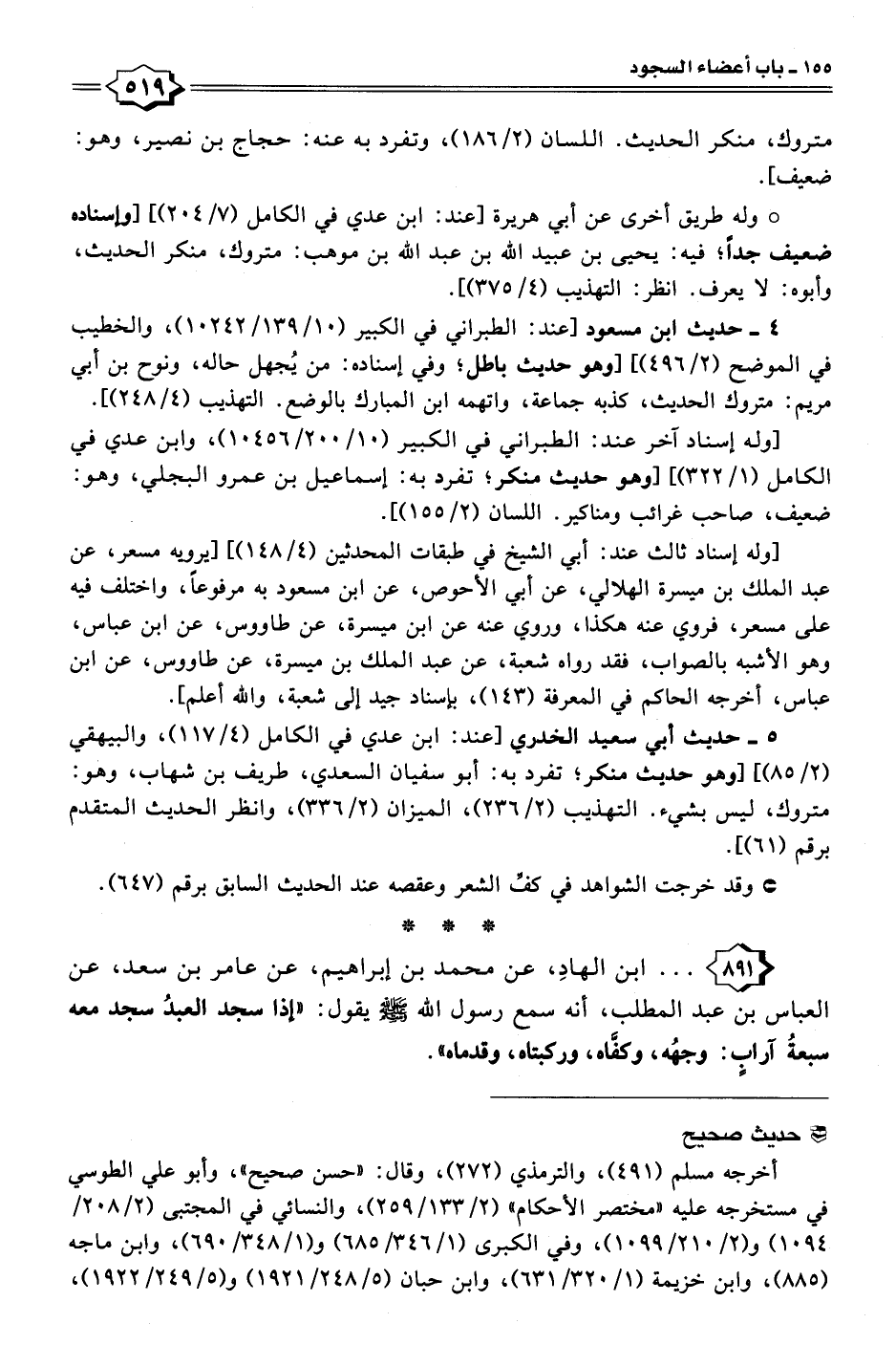 ٨٩١ - . . . ابن الهادِ، عن محمد بن إبراهيم، عن عامر بن سعد، عن العباس بن عبد المطلب، أنه سمع رسول الله - صلى الله عليه وسلم - يقول: "إذا سجد العبدُ سجد معه سبعةُ آرابٍ: وجهُه، وكفَّاه، وركبتاه، وقدماه".