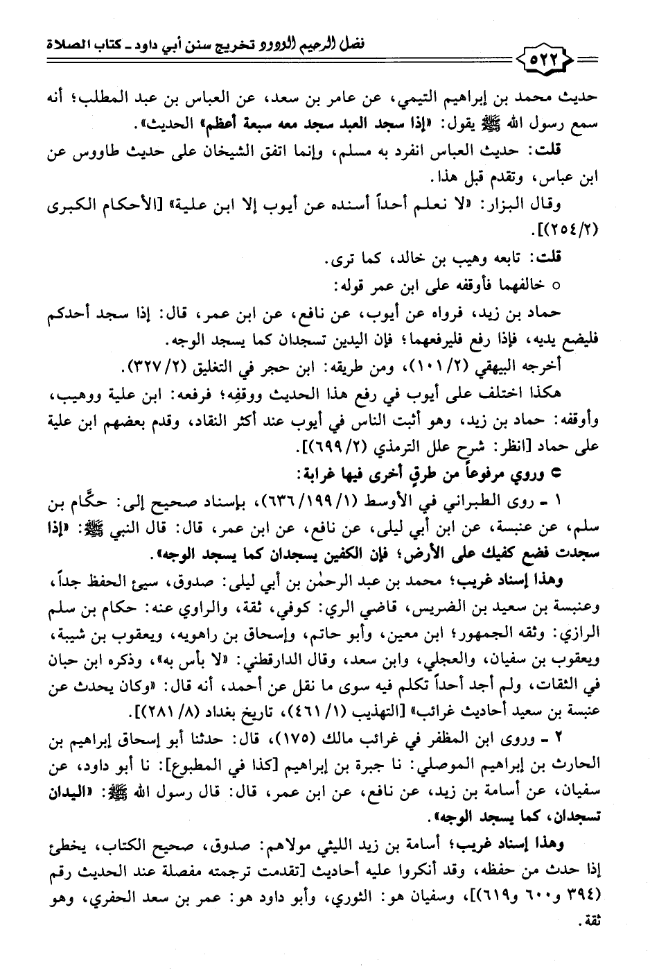 ١ - روى الطبراني في الأوسط (١/ ١٩٩/ ٦٣٦)، بإسناد صحيح إلى: حكَّام بن سلم، عن عنبسة، عن ابن أبي ليلى، عن نافع، عن ابن عمر، قال: قال النبي - صلى الله عليه وسلم -: "إذا سجدت فضع كفيك على الأرض؛ فإن الكفين يسجدان كما يسجد الوجه".