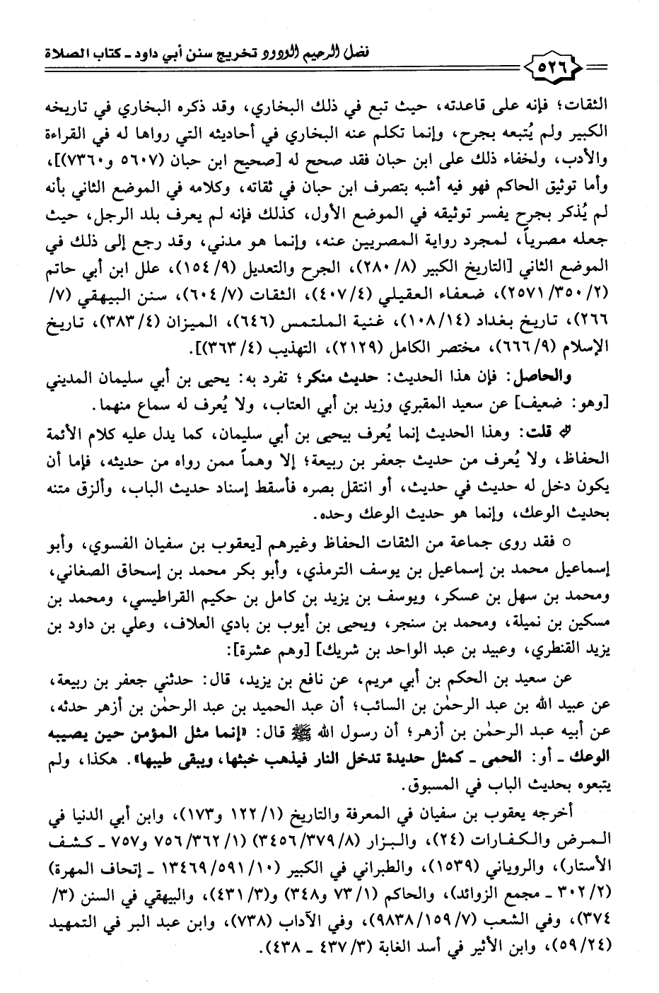 • قلت: وهذا الحديث إنما يُعرف بيحيى بن أبي سليمان، كما يدل عليه كلام الأئمة الحفاظ، ولا يُعرف من حديث جعفر بن ربيعة؛ إلا وهمًا ممن رواه من حديثه، فإما أن يكون دخل له حديث في حديث، أو انتقل بصره فأسقط إسناد حديث الباب، وألزق متنه بحديث الوعك، وإنما هو حديث الوعك وحده.