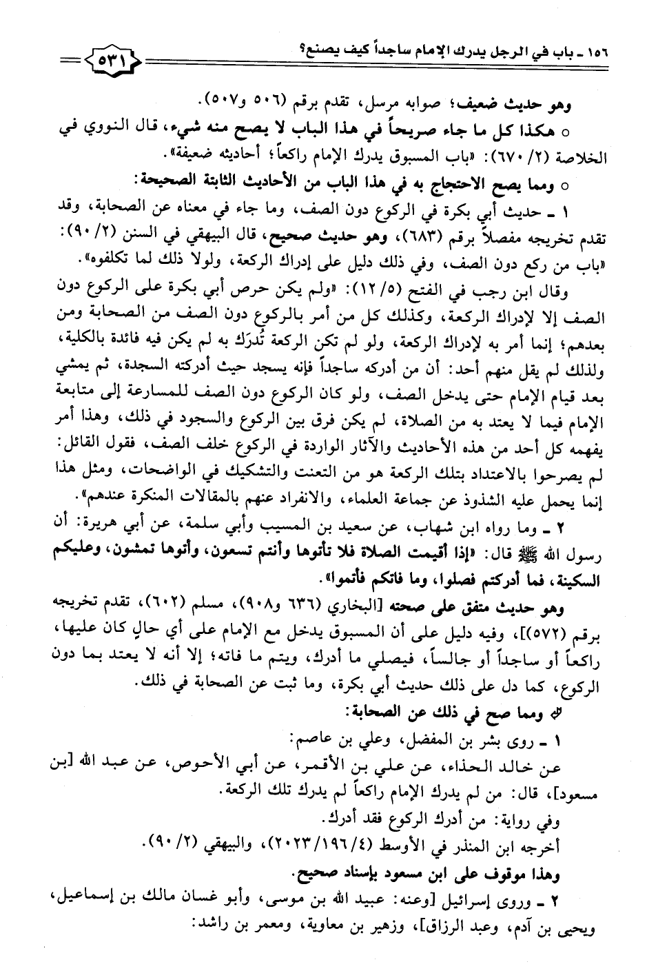 وقال ابن رجب في الفتح (٥/ ١٢): "ولم يكن حرص أبي بكرة على الركوع دون الصف إلا لإدراك الركعة، وكذلك كل من أمر بالركوع دون الصف من الصحابة ومن بعدهم؛ إنما أمر به لإدراك الركعة، ولو لم تكن الركعة تُدرَك به لم يكن فيه فائدة بالكلية، ولذلك لم يقل منهم أحد: أن من أدركه ساجدًا فإنه يسجد حيث أدركته السجدة، ثم يمشي بعد قيام الإمام حتى يدخل الصف، ولو كان الركوع دون الصف للمسارعة إلى متابعة الإمام فيما لا يعتد به من الصلاة، لم يكن فرق بين الركوع والسجود في ذلك، وهذا أمر يفهمه كل أحد من هذه الأحاديث والآثار الواردة في الركوع خلف الصف، فقول القائل: لم يصرحوا بالاعتداد بتلك الركعة هو من التعنت والتشكيك في الواضحات، ومثل هذا إنما يحمل عليه الشذوذ عن جماعة العلماء، والانفراد عنهم بالمقالات المنكرة عندهم".