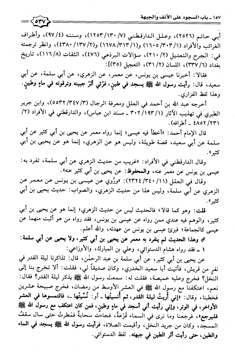 عن يحيى بن أبي كثير، عن أبي سلمة بن عبد الرحمن، قال: تذاكرنا ليلة القدر في نفرٍ من قريش، فأتيت أبا سعيد الخدري، وكان صديقًا لي، فقلت: ألا تخرج بنا إلى النخل؟ فخرج وعليه خميصة، فقلت له: سمعتَ رسول الله - صلى الله عليه وسلم - يذكر ليلة القدر؟ فقال: نعم، اعتكفنا مع رسول الله - صلى الله عليه وسلم - في العشر الأوسط من رمضان، فخرج صبيحة عشرين فخطبنا، وقال: "إني أُريتُ ليلة القدر، ثم أُنسيتُها -أو: نُسِّيتُها-، فالتمسوها في العشر الأواخر، في الوتر، وإني رأيت أني أسجد في ماءٍ وطينٍ، فمن كان اعتكف مع رسول الله - صلى الله عليه وسلم - فليرجع"، فرجعنا وما نرى في السماء قَزَعةً، فجاءت سحابةٌ فمَطرتْ حتى سال سقفُ المسجد، وكان من جريد النخل، وأقيمت الصلاة، فرأيت رسول الله - صلى الله عليه وسلم - يسجد في الماء والطين، حتى رأيت أثر الطين في جبهته. لفظ الدستوائي.