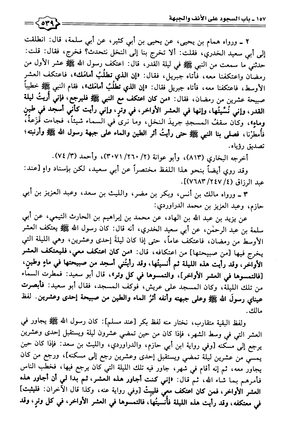 ٣ - ورواه مالك بن أنس، وبكر بن مضر، والليث بن سعد، وعبد العزيز بن أبي حازم، وعبد العزيز بن محمد الدراوردي: عن يزيد بن عبد الله بن الهاد، عن محمد بن إبراهيم بن الحارث التيمي، عن أبي سلمة بن عبد الرحمن، عن أبي سعيد الخدري، أنه قال: كان رسول الله - صلى الله عليه وسلم - يعتكف العشر الأوسط من رمضان، فاعتكف عامًا، حتى إذا كان ليلةَ إحدى وعشرين، وهي الليلة التي يخرج فيها [من صبيحتها] من اعتكافه، قال: "من كان اعتكف معي، فليعتكف العشر الأواخر، وقد رأيت هذه الليلة ثم أُنسيتُها، وقد رأيتُني أسجد من صبيحتها في ماءٍ وطينٍ، [فالتمسوها في العشر الأواخر]، والتمسوها في كل وتر"، قال أبو سعيد: فمطرت السماء من تلك الليلة، وكان المسجد على عريش، فوكف المسجد، فقال أبو سعيد: فأبصرت عيناي رسولَ الله - صلى الله عليه وسلم - وعلى جبهته وأنفه أثرُ الماء والطين من صبيحة إحدى وعشرين. لفظ مالك.