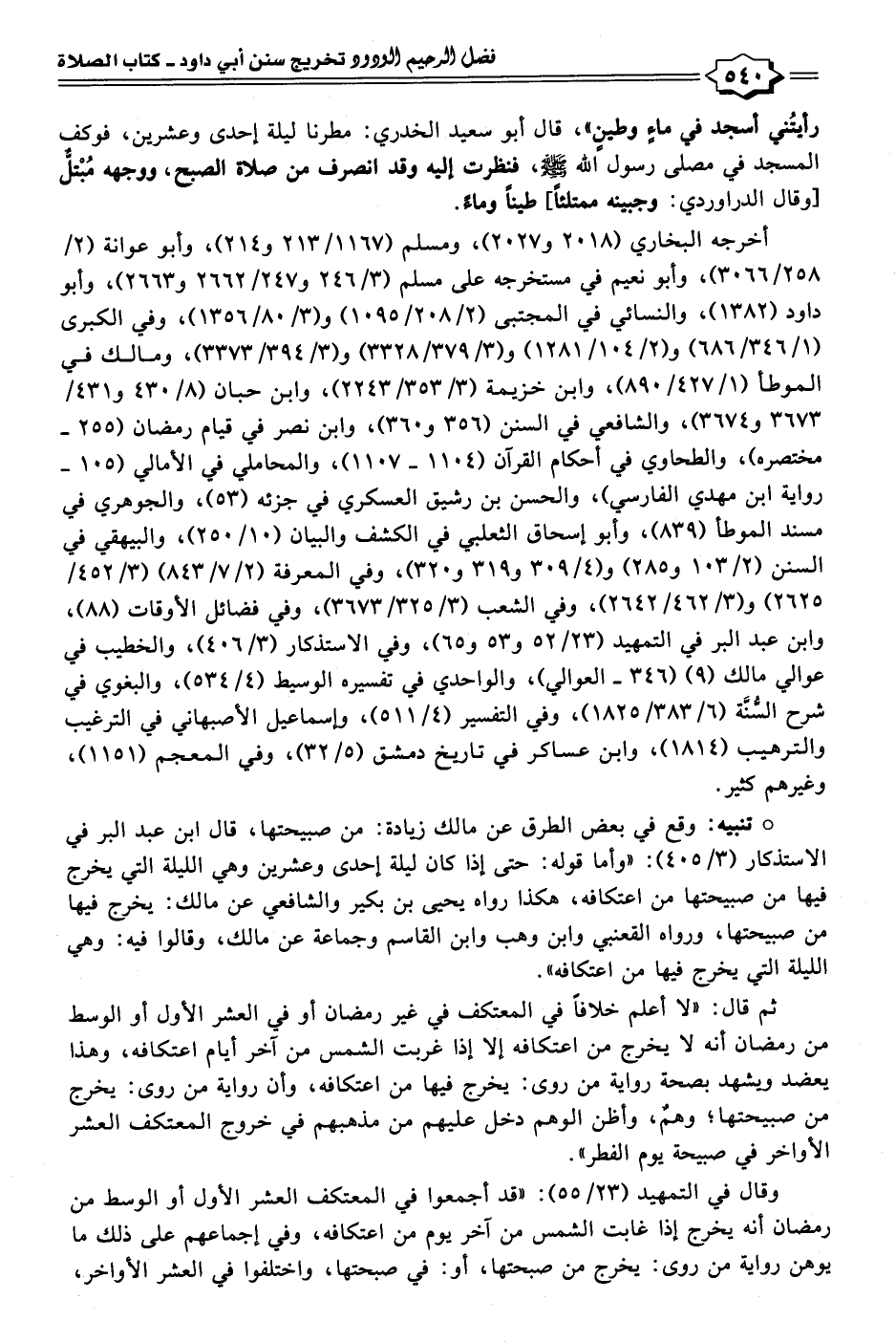 رأيتُني أسجد في ماءٍ وطينٍ"، قال أبو سعيد الخدري: مطرنا ليلة إحدى وعشرين، فوكف المسجد في مصلى رسول الله - صلى الله عليه وسلم -، فنظرت إليه وقد انصرف من صلاة الصبح، ووجهه مُبْتلٌ [وقال الدراوردي: وجبينه ممتلئًا] طينًا وماءً.