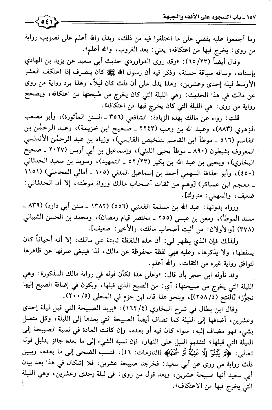 وقال أيضًا (٢٣/ ٦٥): "وقد روى الدراوردي حديث أبي سعيد عن يزيد بن الهادي بإسناده، وساقه سياقة حسنة، وذكر فيه أن رسول الله - صلى الله عليه وسلم - كان ينصرف إذا اعتكف العشر الأوسط ليلة إحدى وعشرين، وهذا يدل على أن ذلك كان ليلًا، وهذا يرد رواية من روى عن مالك في هذا الحديث: وهي الليلة التي كان يخرج من صُبحتها من اعتكافه، ويصحح رواية من روى: هي الليلة التي كان يخرج فيها من اعتكافه".