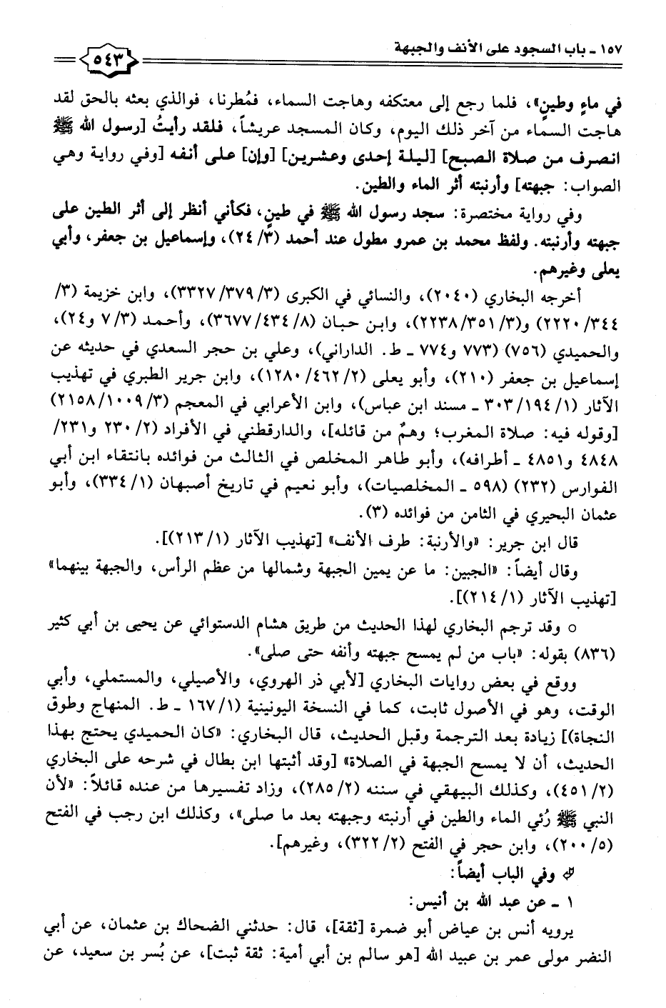 • وقد ترجم البخاري لهذا الحديث من طريق هشام الدستوائي عن يحيى بن أبي كثير (٨٣٦) بقوله: "باب من لم يمسح جبهته وأنفه حتى صلى".
